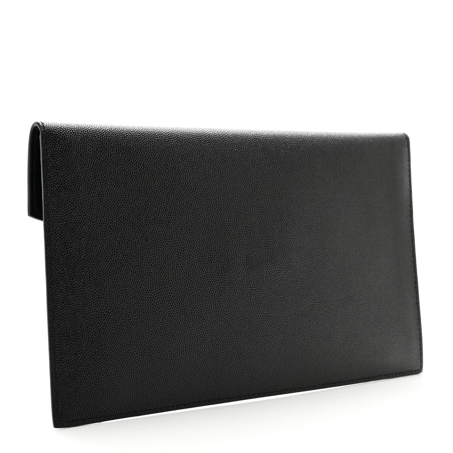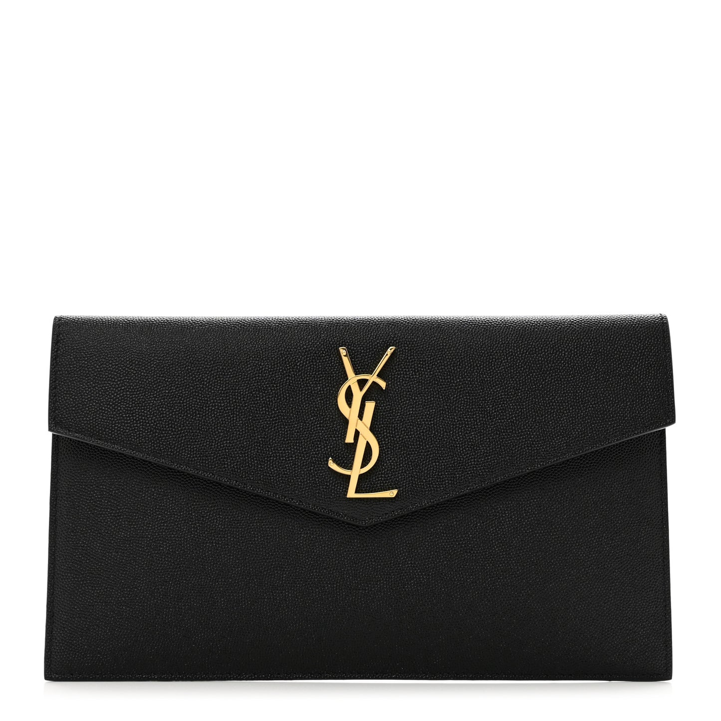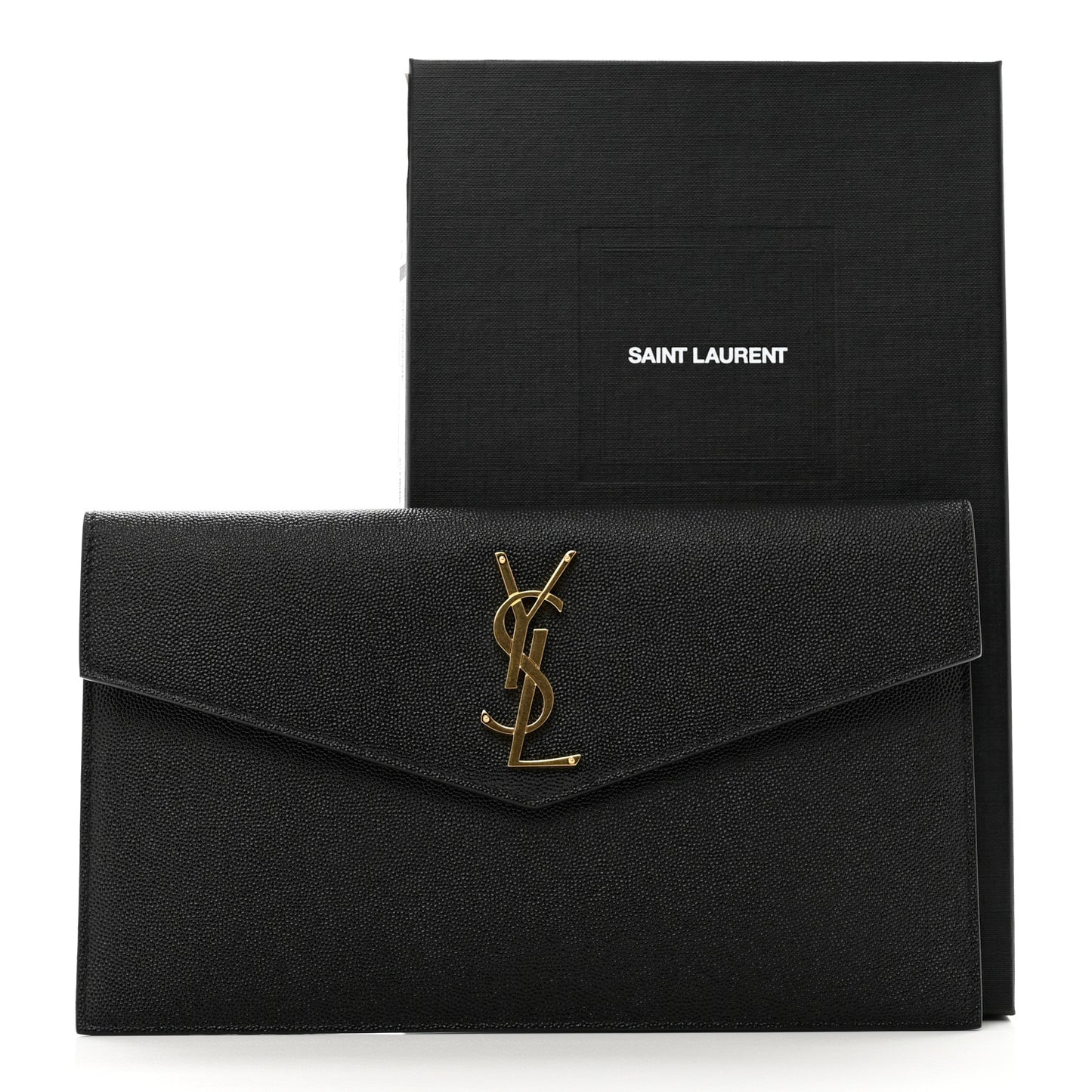 This is an authentic SAINT LAURENT Grain De Poudre Uptown Pouch in Black. This clutch is crafted of pebbled black calfskin leather with an envelope style front flap and a gold YSL logo. The flap opens to a black fabric interior.Follow this item for alerts. Saint Laurent is a registered trademark of Saint Laurent. FASHIONPHILE is not affiliated with Saint Laurent.