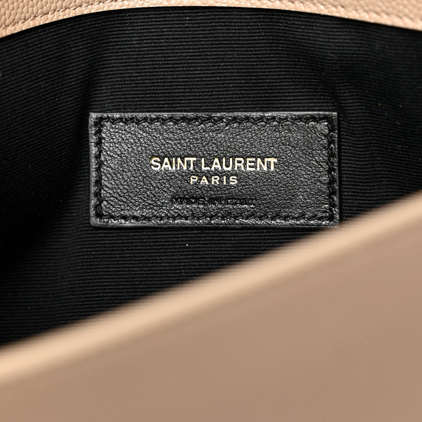 This is an authentic SAINT LAURENT Grain De Poudre Uptown Pouch in Dark Beige. This clutch is crafted of grained calfskin leather in beige and features a facing V-shaped flap with a prominent polished gold YSL logo. The flap opens to a black fabric interior.Follow this item for alerts. Saint Laurent is a registered trademark of Saint Laurent. FASHIONPHILE is not affiliated with Saint Laurent.