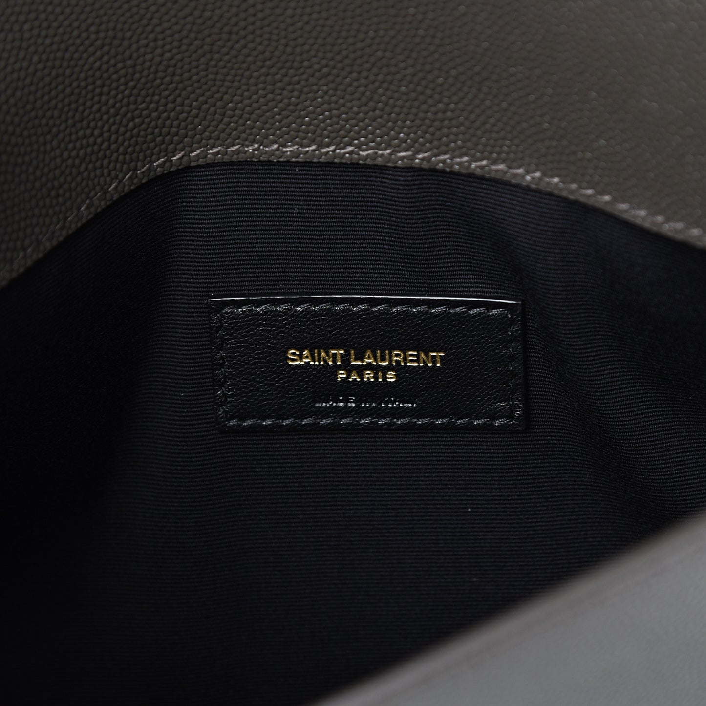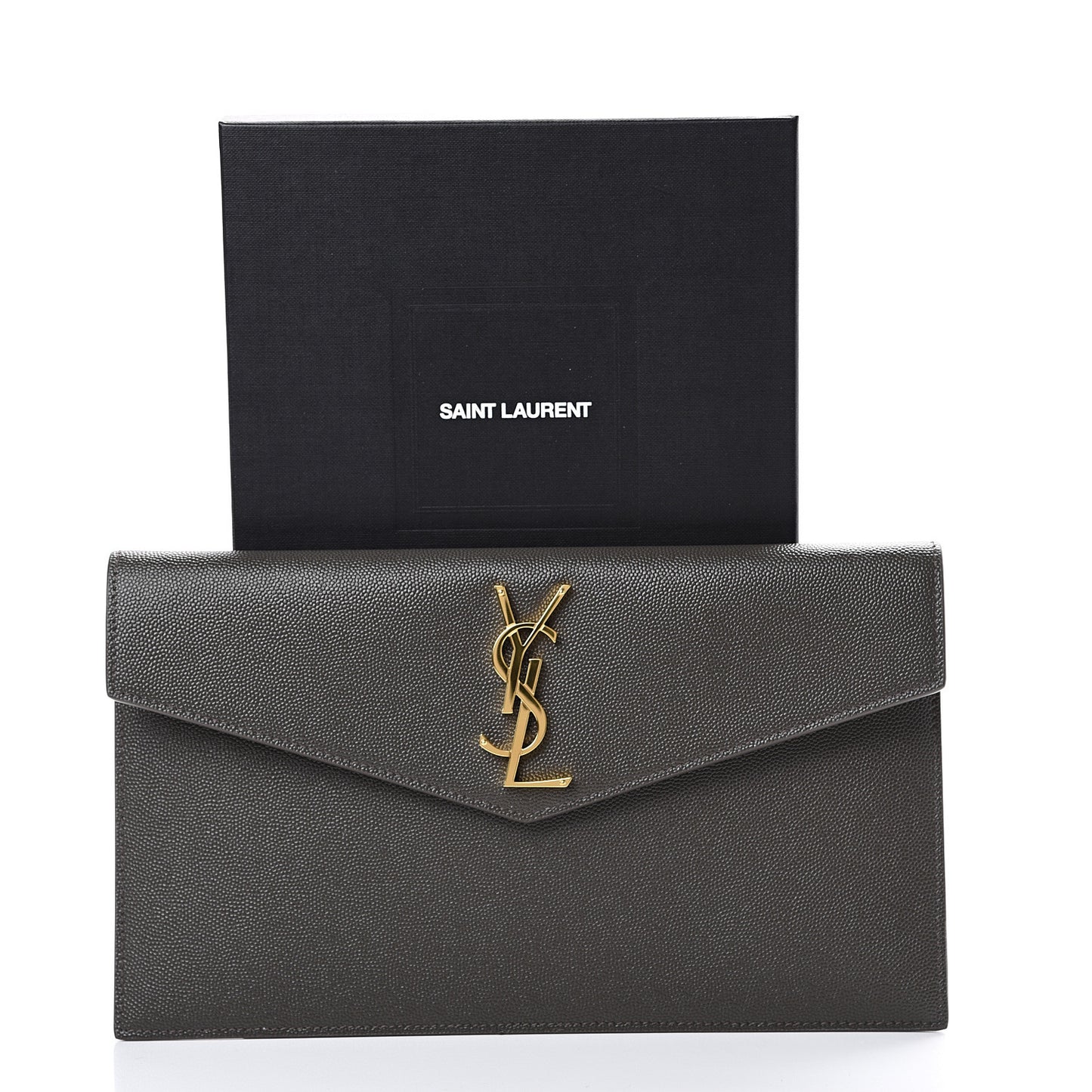 This is an authentic SAINT LAURENT Grain De Poudre Uptown Pouch in Pebble. This clutch is crafted of grained calfskin leather in grey and features a facing V-shaped flap with a prominent gold-tone YSL logo. The flap opens to a black fabric interior with room for just the essentials. This is a perfect clutch for day or evening wear, from Saint Laurent!