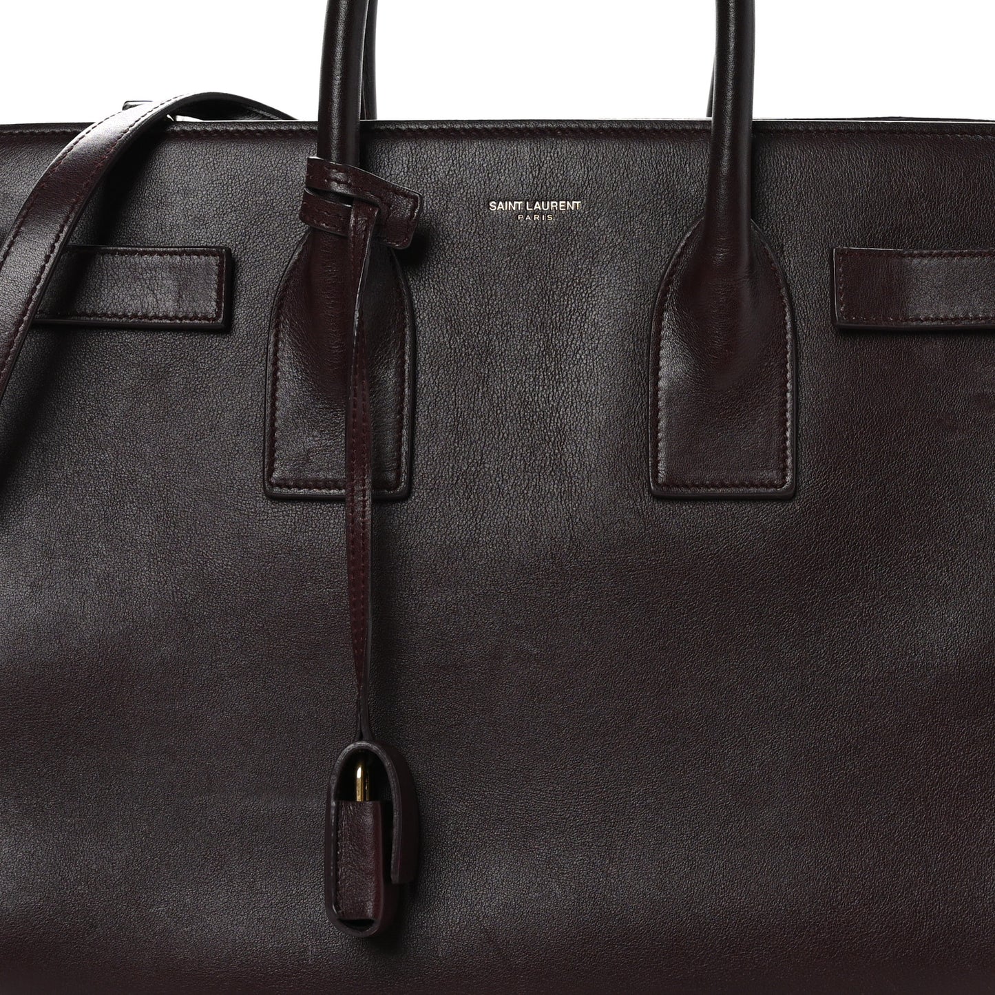 This is an authentic SAINT LAURENT Grained Calfskin Small Classic Sac De Jour in Bordeaux. This elegant tote is crafted of luxuriously grained calfskin leather in a deep plum purple. The shoulder bag features rolled leather top handles and short side straps that can be undone to increase the width of the bag. The top is open to a matching leather interior with a central zipper pocket.Follow this item for alerts. Saint Laurent is a registered trademark of Saint Laurent. FASHIONPHILE is not affiliated with Saint Laurent.
