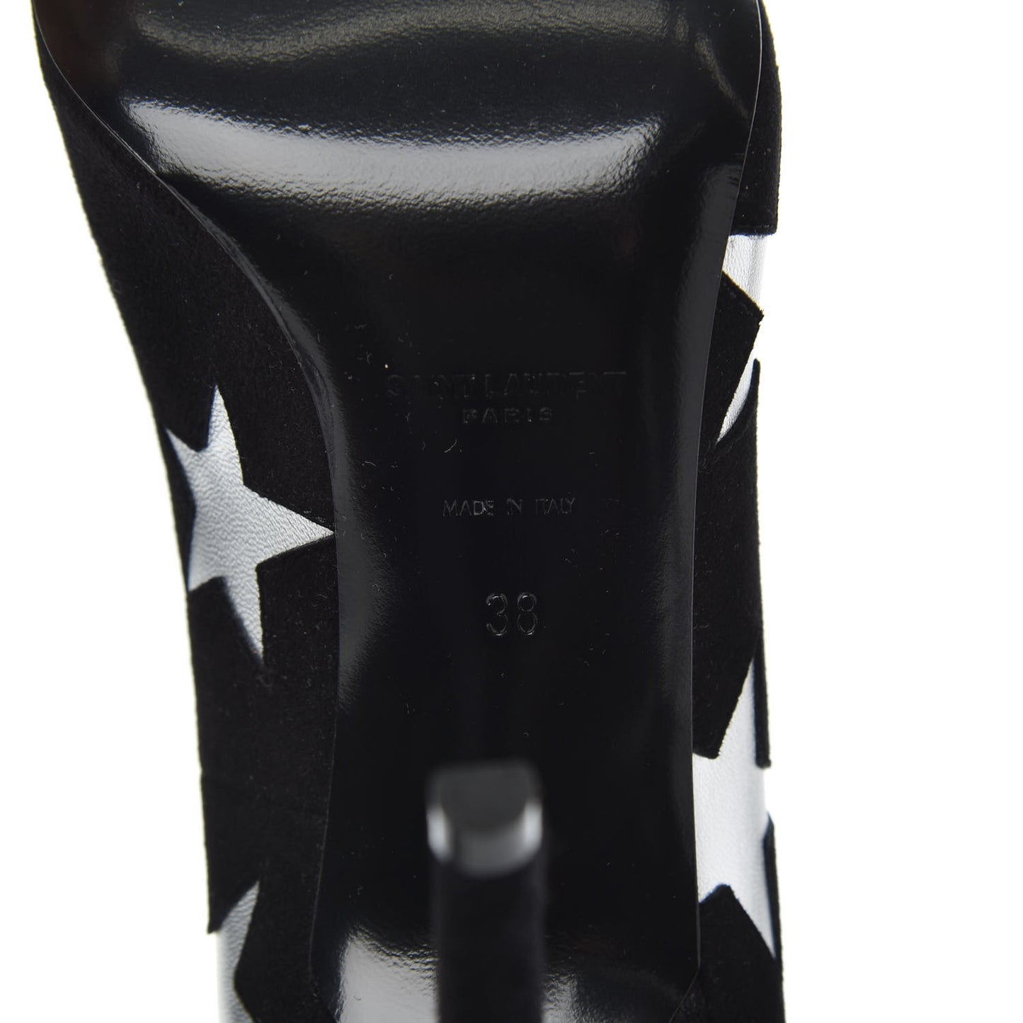These are authentic SAINT LAURENT Kid Scamosciato Anja Star 105 Pumps size 38 in Black and Silver. These stunning pumps are crafted of black velvet, with metallic silver leather stars throughout. They feature a pointed toe and a 4.25-inch heel.Follow this item for alerts. Saint Laurent is a registered trademark of Saint Laurent. FASHIONPHILE is not affiliated with Saint Laurent.