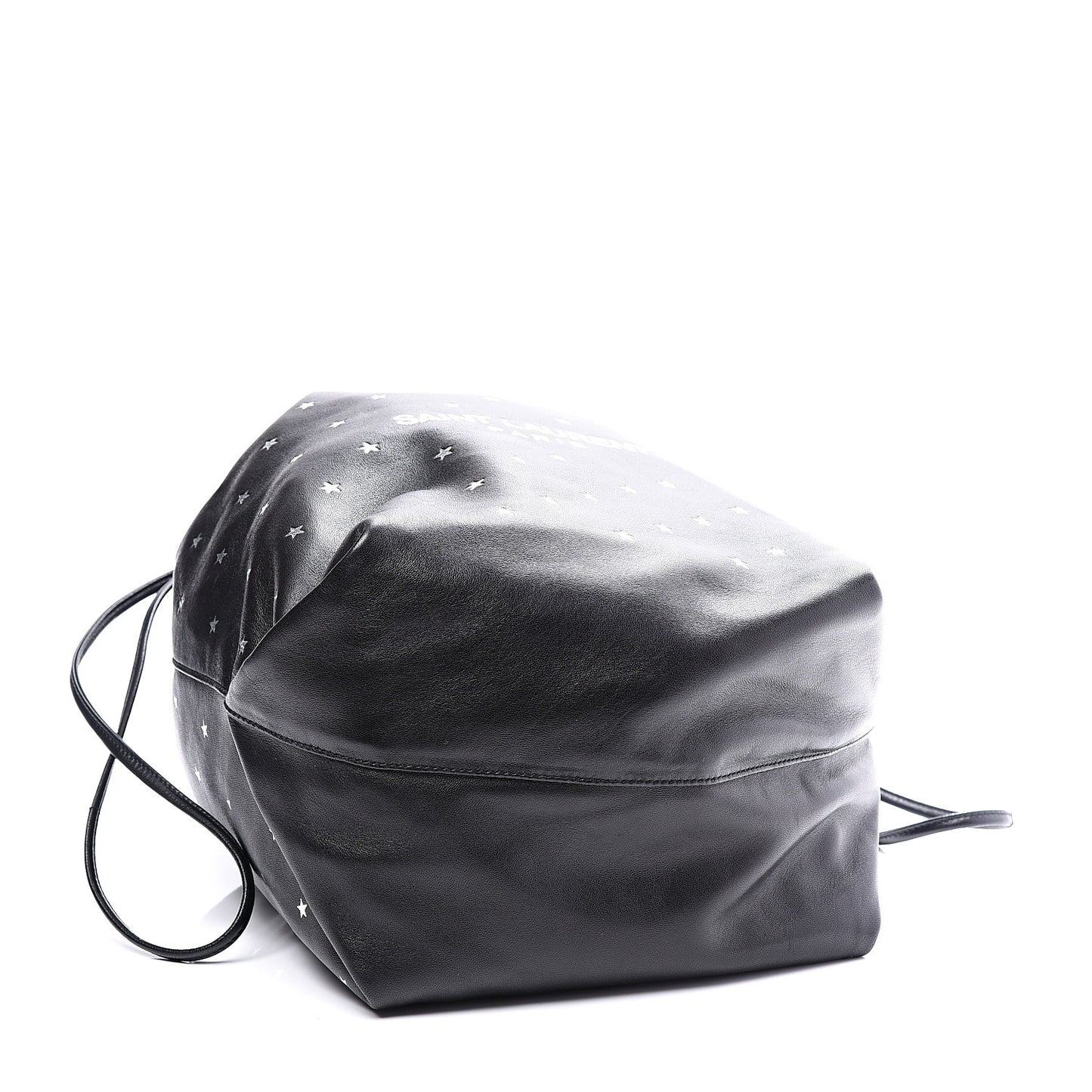 This is an authentic SAINT LAURENT Lambskin Star Printed Teddy Drawstring Bag in Black. This classic bucket-shaped bag is crafted of smooth lambskin leather in black with silver stars and a Saint Laurent logo on the front. The bag features a drawstring top and an aged silver chain shoulder strap with a leather shoulder pad. The top opens to a spacious black fabric interior with a companion pouch.Follow this item for alerts. Saint Laurent is a registered trademark of Saint Laurent. FASHIONPHILE is not affiliated with Saint Laurent.