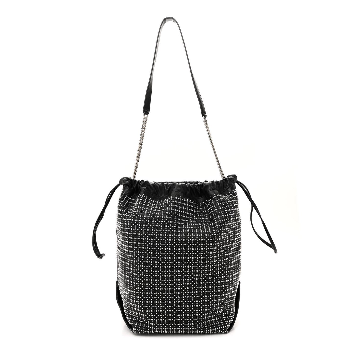This is an authentic SAINT LAURENT Lambskin Studded Drawstring Bag in Black. This classic bucket-shaped bag is crafted of smooth lambskin leather in black with silver Studs. The bag features a drawstring top and an aged silver chain shoulder strap with a leather shoulder pad. The top opens to a spacious black fabric interior with a companion pouch.Follow this item for alerts. Saint Laurent is a registered trademark of Saint Laurent. FASHIONPHILE is not affiliated with Saint Laurent.