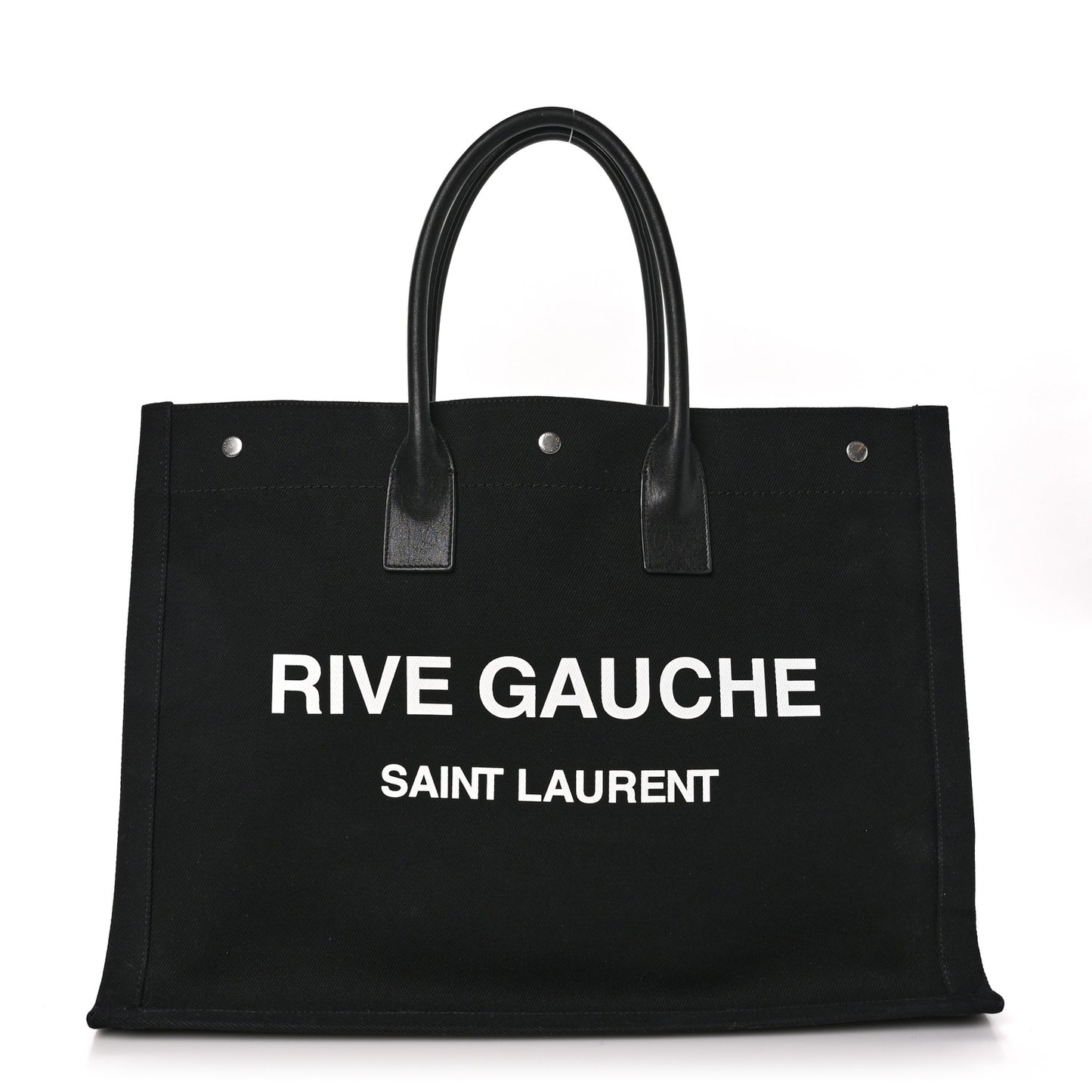 This is an authentic SAINT LAURENT Linen Calfskin Rive Gauche Tote in Black. This stylish tote is crafted of black linen with "Rive Gauche, Saint Laurent" printed in white across the front. The tote features black rolled leather handles and is open to a spacious interior with a hanging zipper pocket.Follow this item for alerts. Saint Laurent is a registered trademark of Saint Laurent. FASHIONPHILE is not affiliated with Saint Laurent.