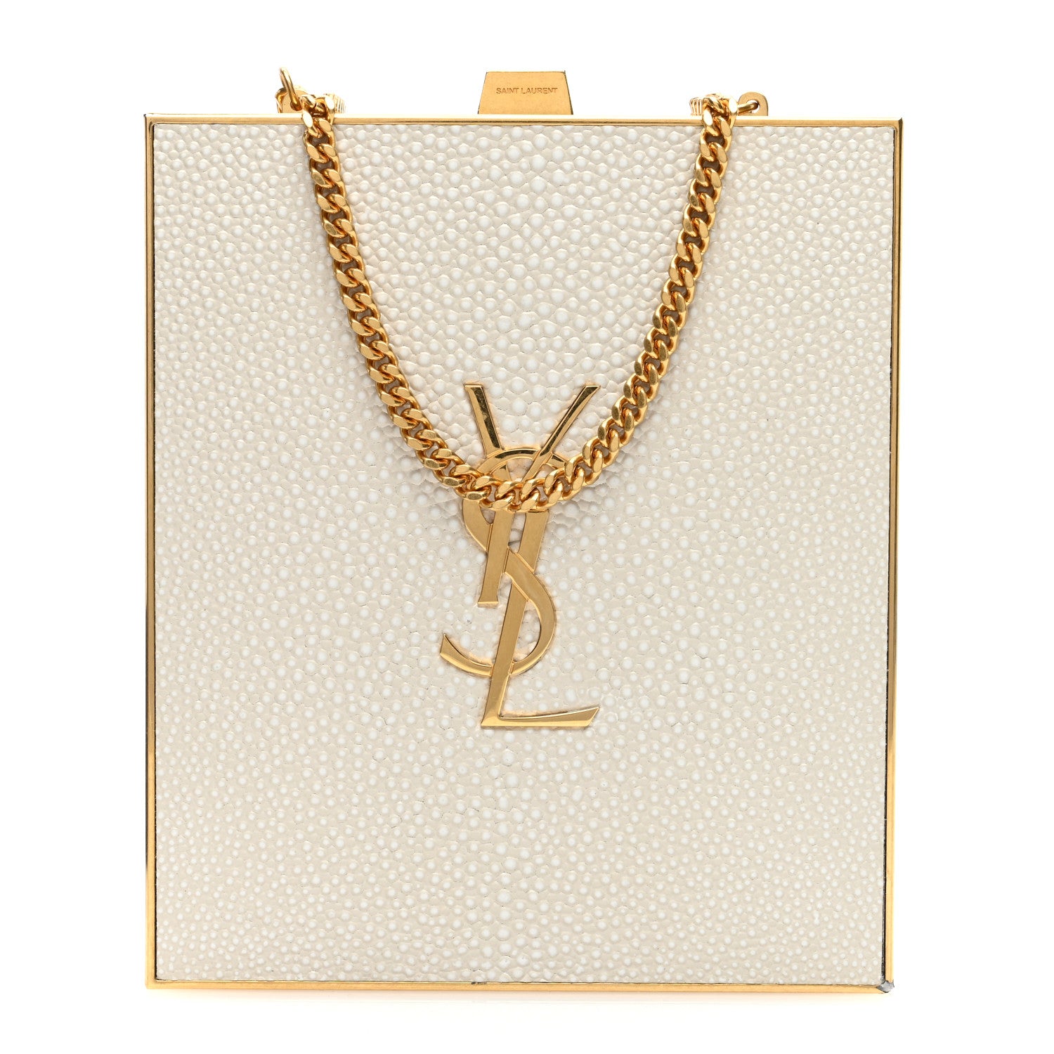Saint Laurent/ Bags/ Shoulder Bags /Saint Laurent Metal Calfskin Shagreen Embossed Monogram Minaudiere Tuxedo Box Clutch Blanc Vintage Light Bronze