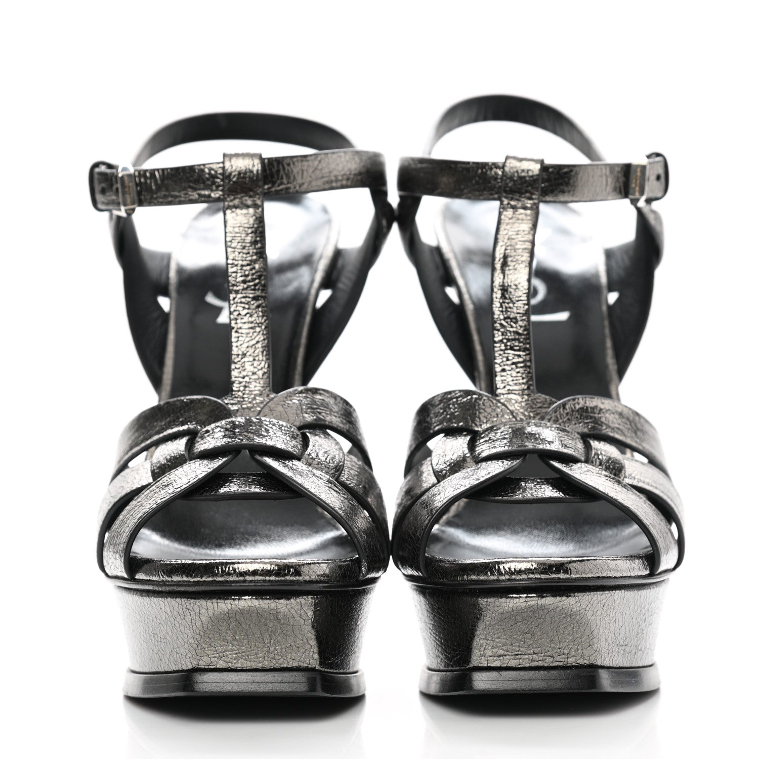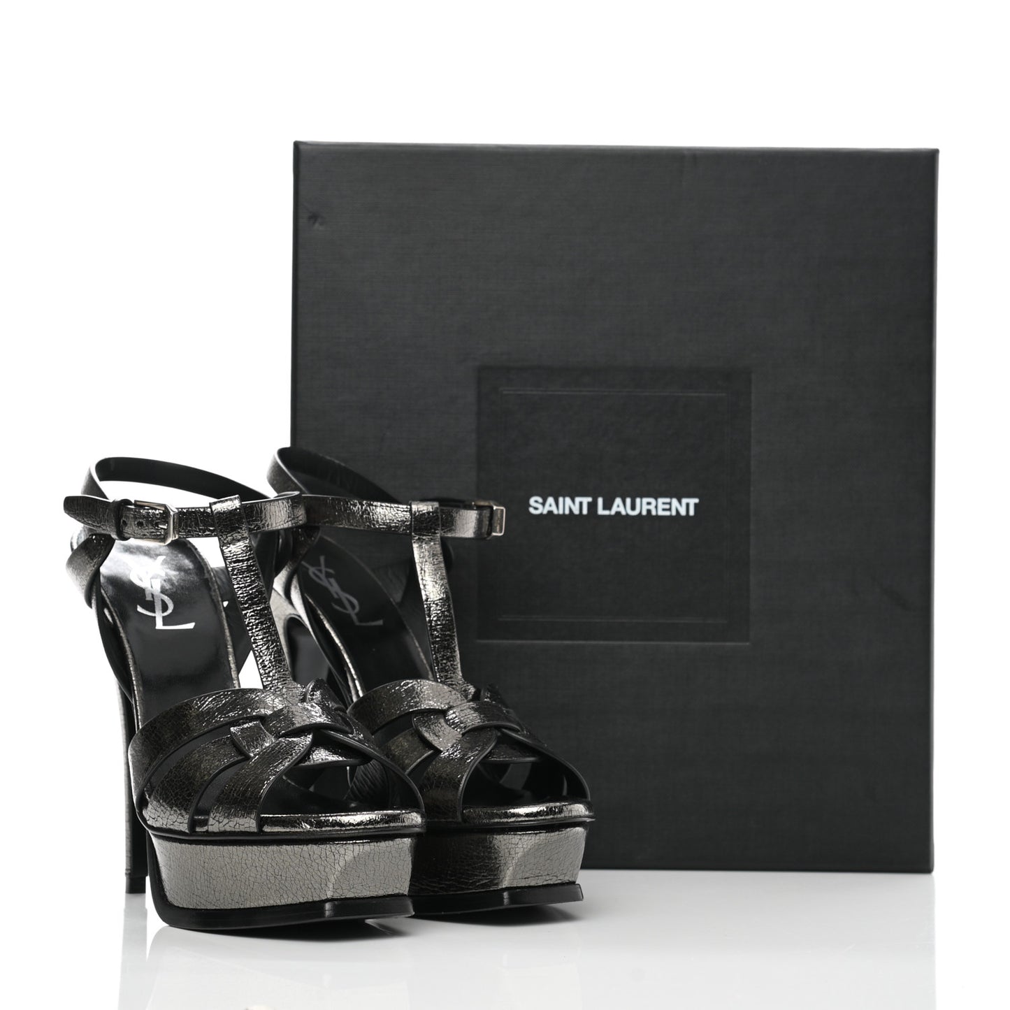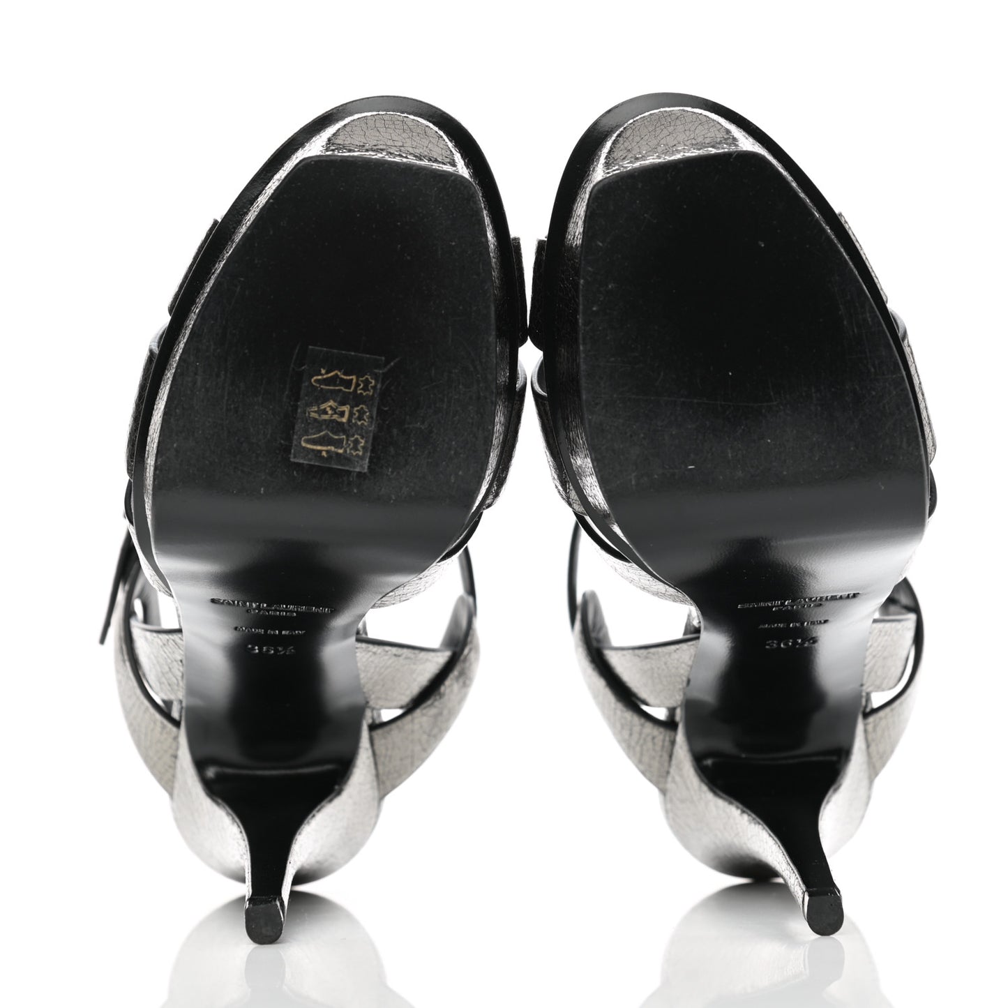 This is an authentic pair of SAINT LAURENT Metallic Calfskin Tribute 105 Platform Sandals size 36.5 in black. These super chic sandals are crafted of metallic leather in black with silver hardware, a 1.25 inch wrapped leather platform, and stiletto heel.Follow this item for alerts. Saint Laurent is a registered trademark of Saint Laurent. FASHIONPHILE is not affiliated with Saint Laurent.