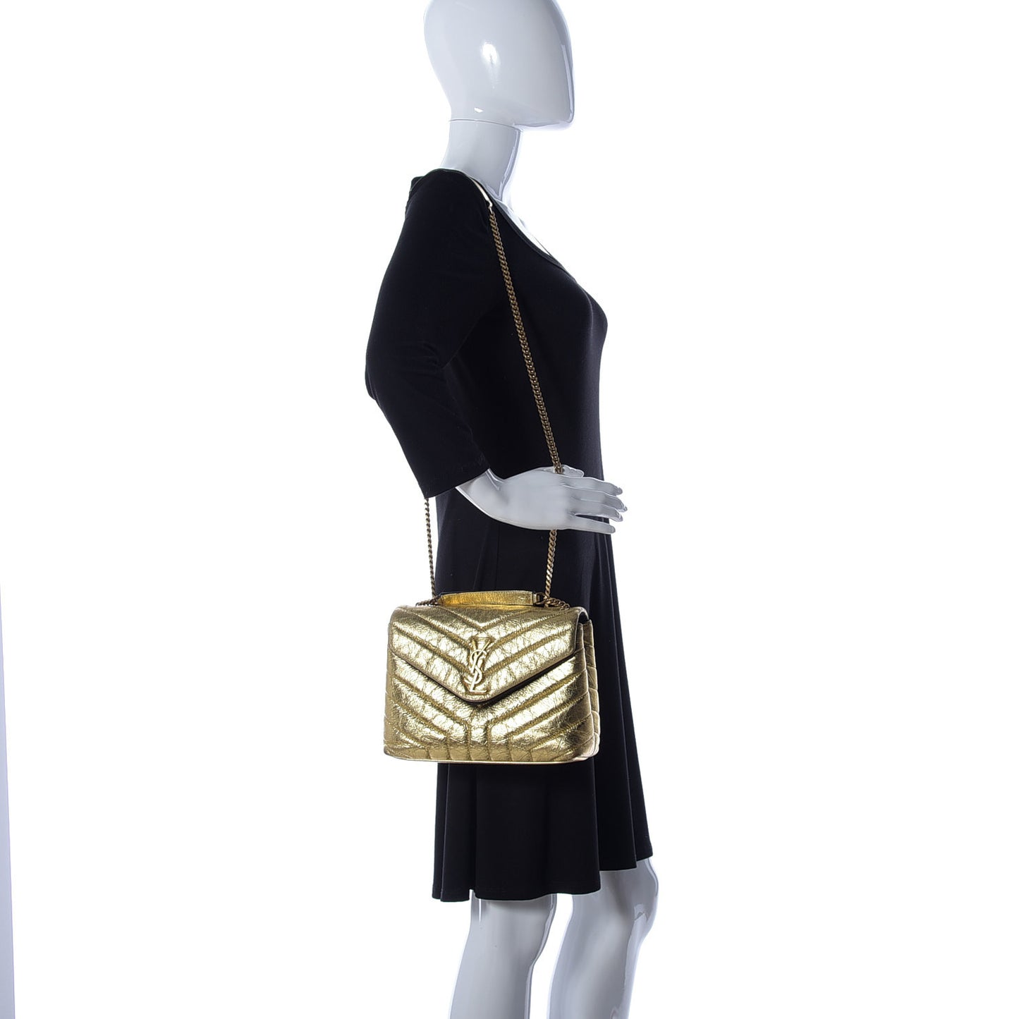 This is an authentic SAINT LAURENT Metallic Calfskin Y Quilted Small Loulou Monogram Chain Satchel in Gold. This elegant shoulder bag is crafted of chevron-quilted calfskin leather in metallic gold. The bag features an aged gold chain-link shoulder strap with shoulder pads, and a matching gold YSL logo on the crossover flap. The bag opens with a magnetic snap to a partitioned black fabric interior with zipper and patch pockets.Follow this item for alerts. Saint Laurent is a registered trademark of Saint Laurent. FASHIONPHILE is not affiliated with Saint Laurent.