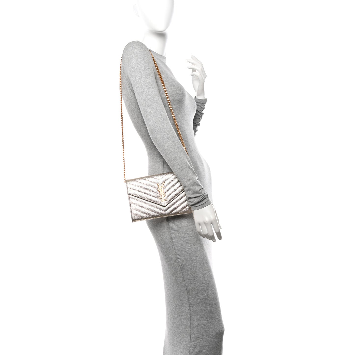 Saint Laurent/ Bags/ Wallet Style /Saint Laurent Metallic Crackled Calfskin Matelasse Chevron Monogram Chain Wallet Gold