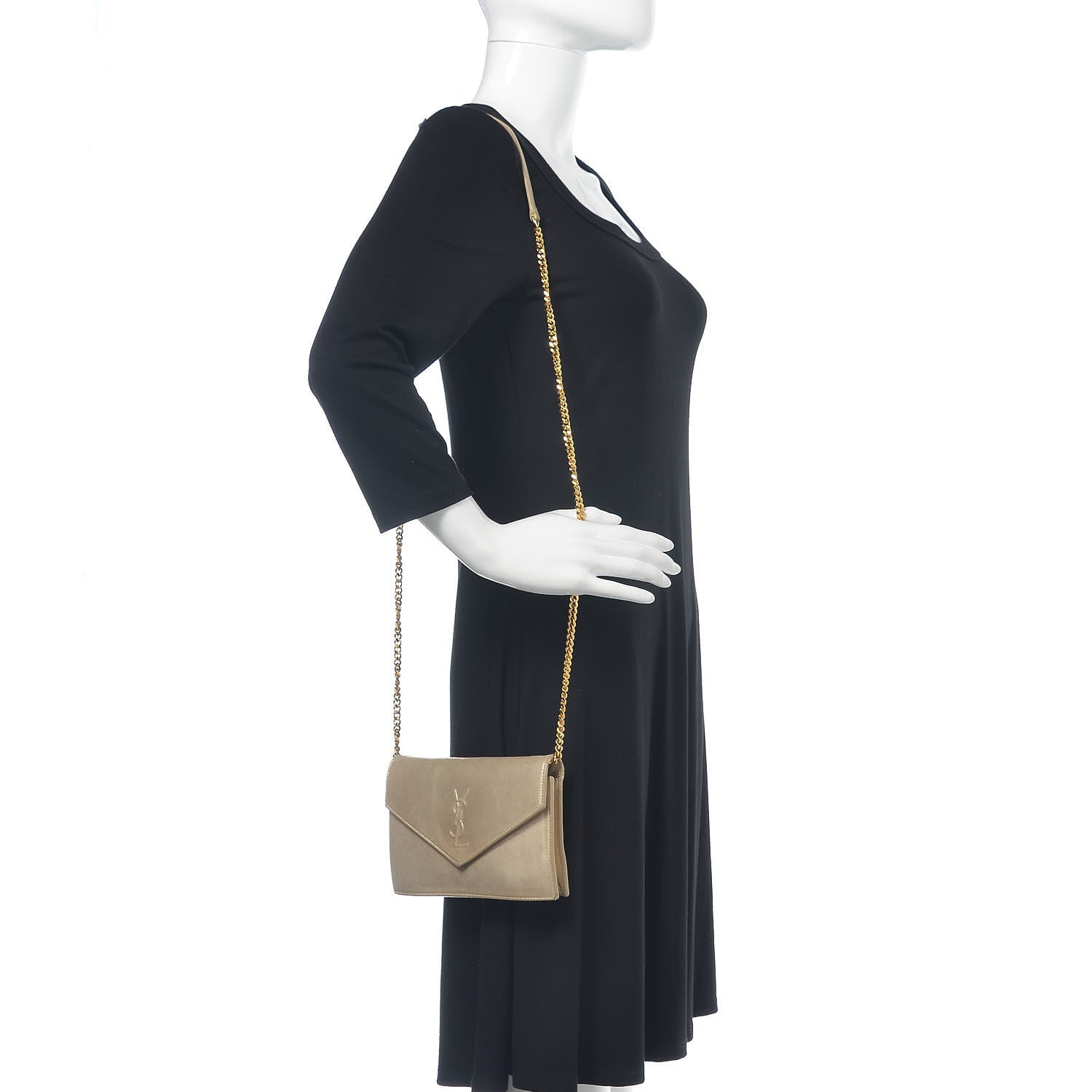 This is an authentic SAINT LAURENT Metallic Fabric Monogram Envelope Chain Wallet in Champagne. This elegant wallet on a chain is crafted of shimmery iridescent smooth leather in champagne. The bag features a waist-length gold chain shoulder strap with a shoulder pad and a gold classic YSL emblem on the flap. This opens to a black leather interior with card slots, zipper pocket, and patch pockets. This stunning wallet is ideal for any occasion, from Saint Laurent!Follow this item for alerts. Saint Laurent is a registered trademark of Saint Laurent. FASHIONPHILE is not affiliated with Saint Laurent.