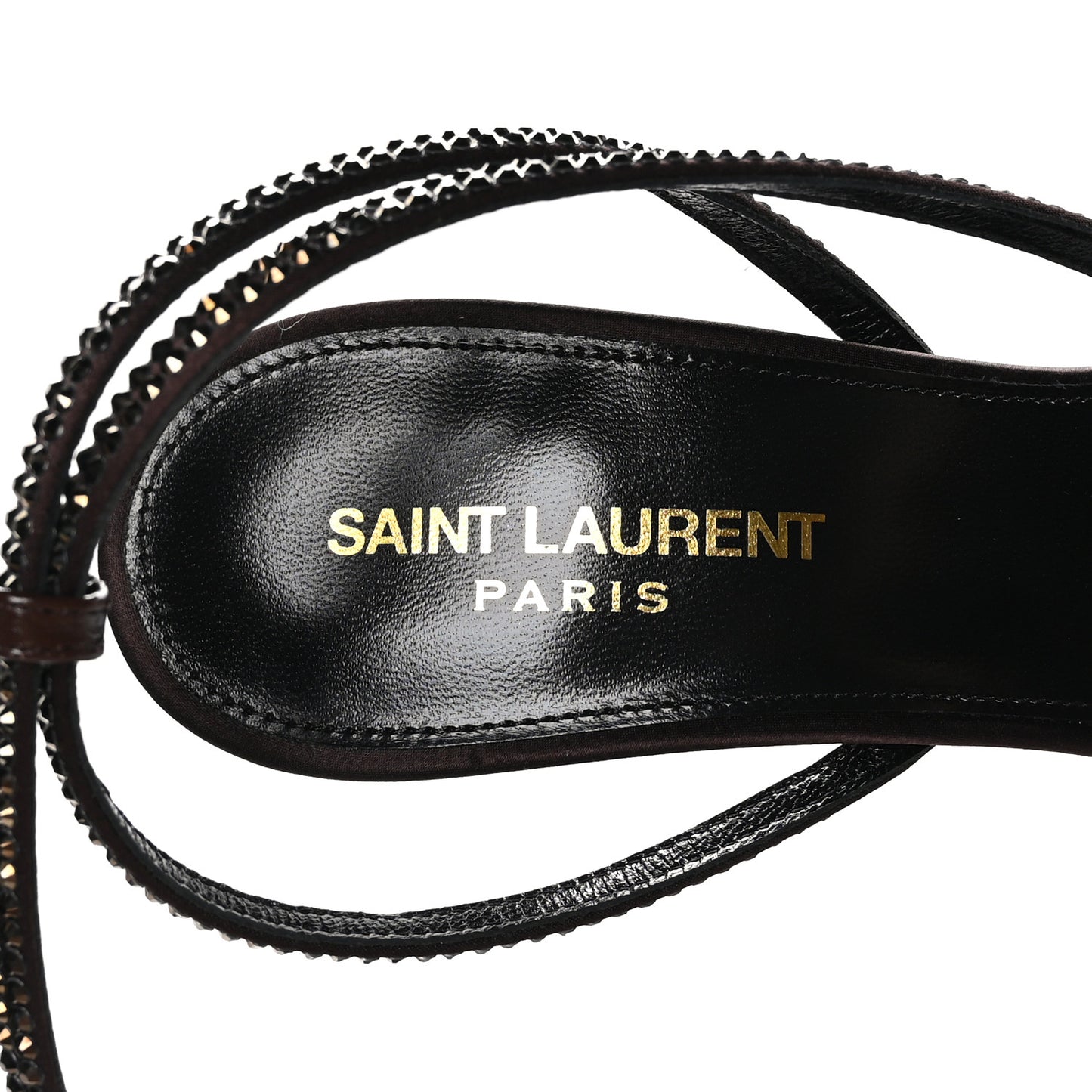 This is an authentic pair of SAINT LAURENT Satin Crystal Ava 105 Sandals size 38 in Amaranth. They are crafted of brown satin material with sparkling crystal accents. The heels feature an open toe, sleek ankle straps with a side buckle, and 4.5-inch heels.