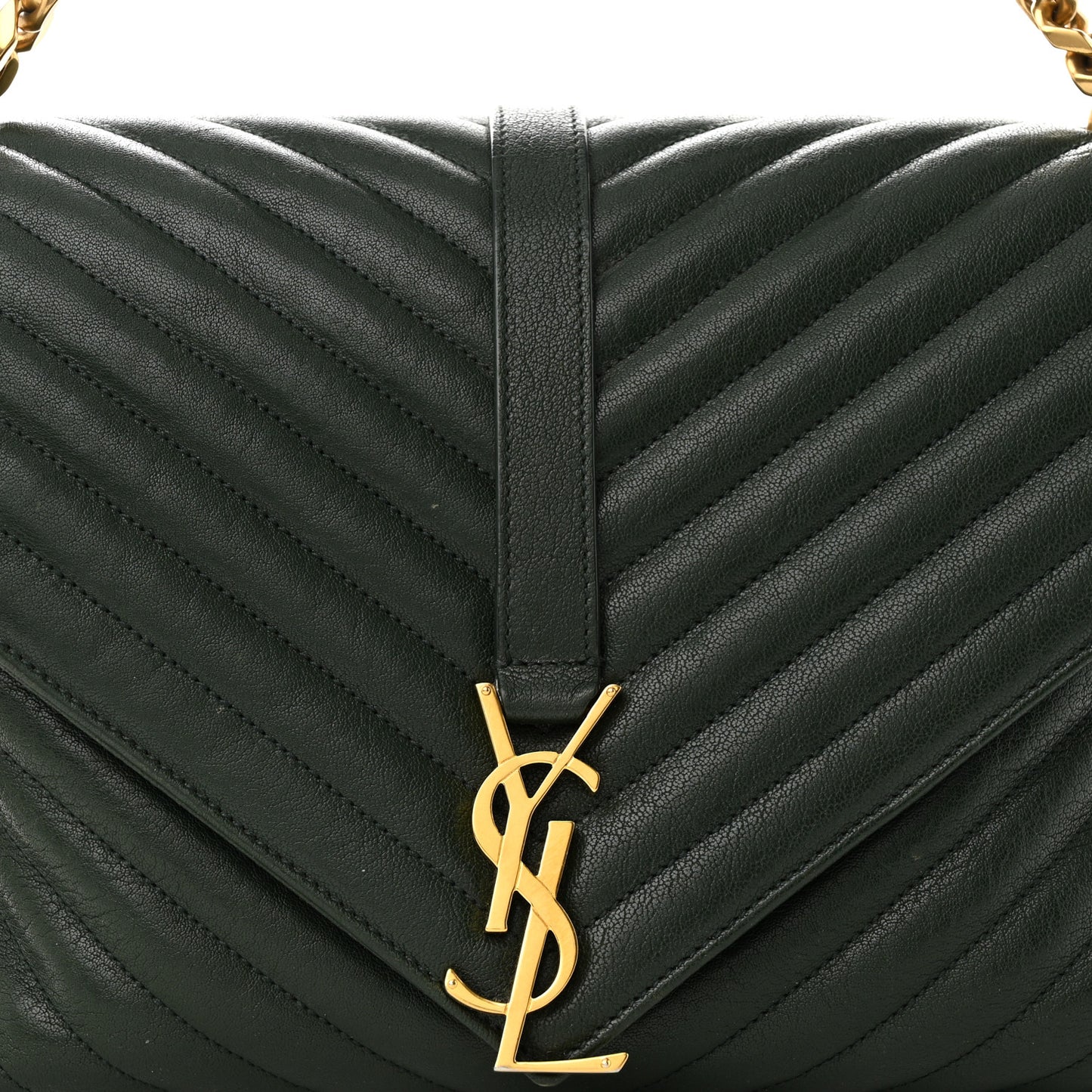 This is an authentic SAINT LAURENT Sheepskin Matelasse Chevron Monogram Large College Satchel in Dark Green. This elegant shoulder tote is crafted of green sheepskin chevron quilting at both the front and the back with smooth leather sides. The bag features a rear patch pocket, an aged gold bijoux chain link shoulder strap with a leather shoulder pad, a leather top handle with aged gold links and a front flap with a prominent aged gold YSL monogram detail. This opens to a partitioned black fabric and leather interior with a patch pocket and a central dividing zipper compartment.Follow this item for alerts. Saint Laurent is a registered trademark of Saint Laurent. FASHIONPHILE is not affiliated with Saint Laurent.