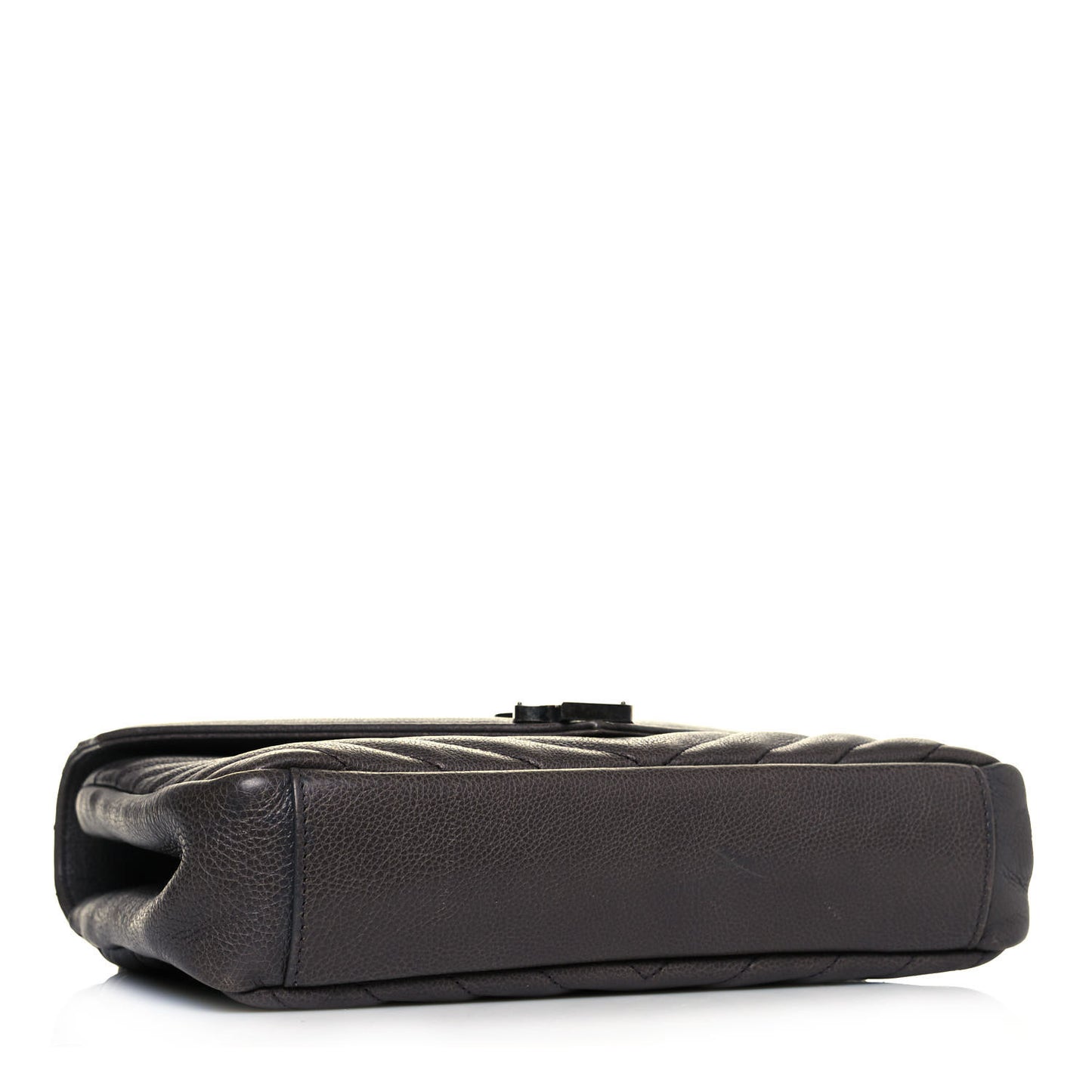This is an authentic SAINT LAURENT Sheepskin Matelasse Chevron Monogram Medium College Bag in Asphalt. This elegant shoulder tote is crafted of chevron-quilted sheepskin leather in grey. The bag features a rear patch pocket, a grey leather top handle, and an optional ruthenium chain link shoulder strap with a leather shoulder pad. The crossover flap showcases a prominent metal YSL monogram detail and opens to a partitioned black fabric interior with zipper and patch pockets.Follow this item for alerts. Saint Laurent is a registered trademark of Saint Laurent. FASHIONPHILE is not affiliated with Saint Laurent.
