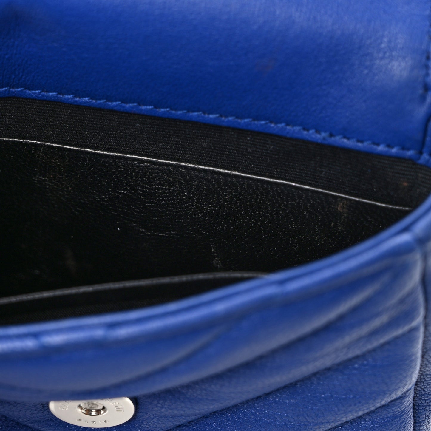 This is an authentic SAINT LAURENT Sheepskin Matelasse Chevron Monogram Mini College Bag in Poncho. This elegant hand bag features finely grained chevron quilted sheepskin leather in blue. The bag features a rear pocket, an aged gold chain link shoulder strap and a facing V- shaped flap with a prominent gold YSL logo. The flap opens to a black fabric interior with patch pockets with room for daytime or evening wear with the classic chic of Saint Laurent!Follow this item for alerts. Saint Laurent is a registered trademark of Saint Laurent. FASHIONPHILE is not affiliated with Saint Laurent.