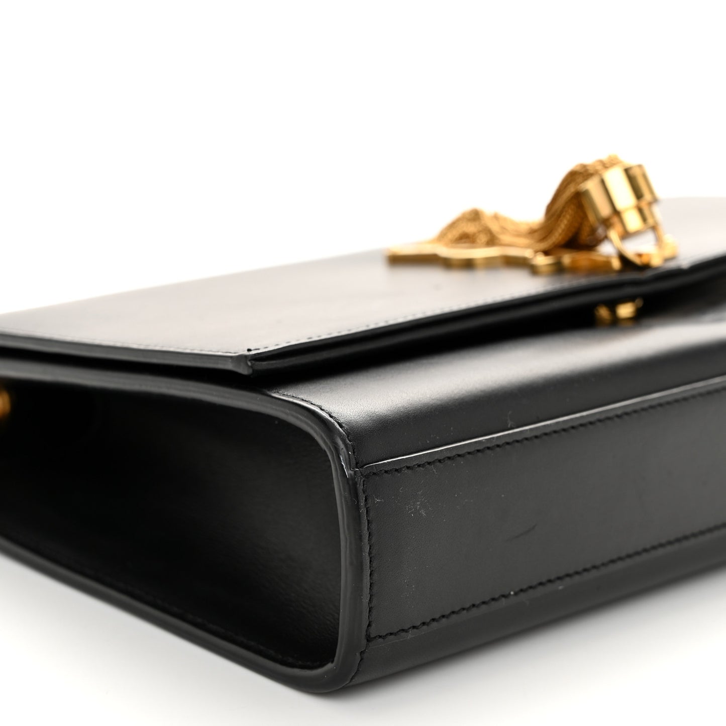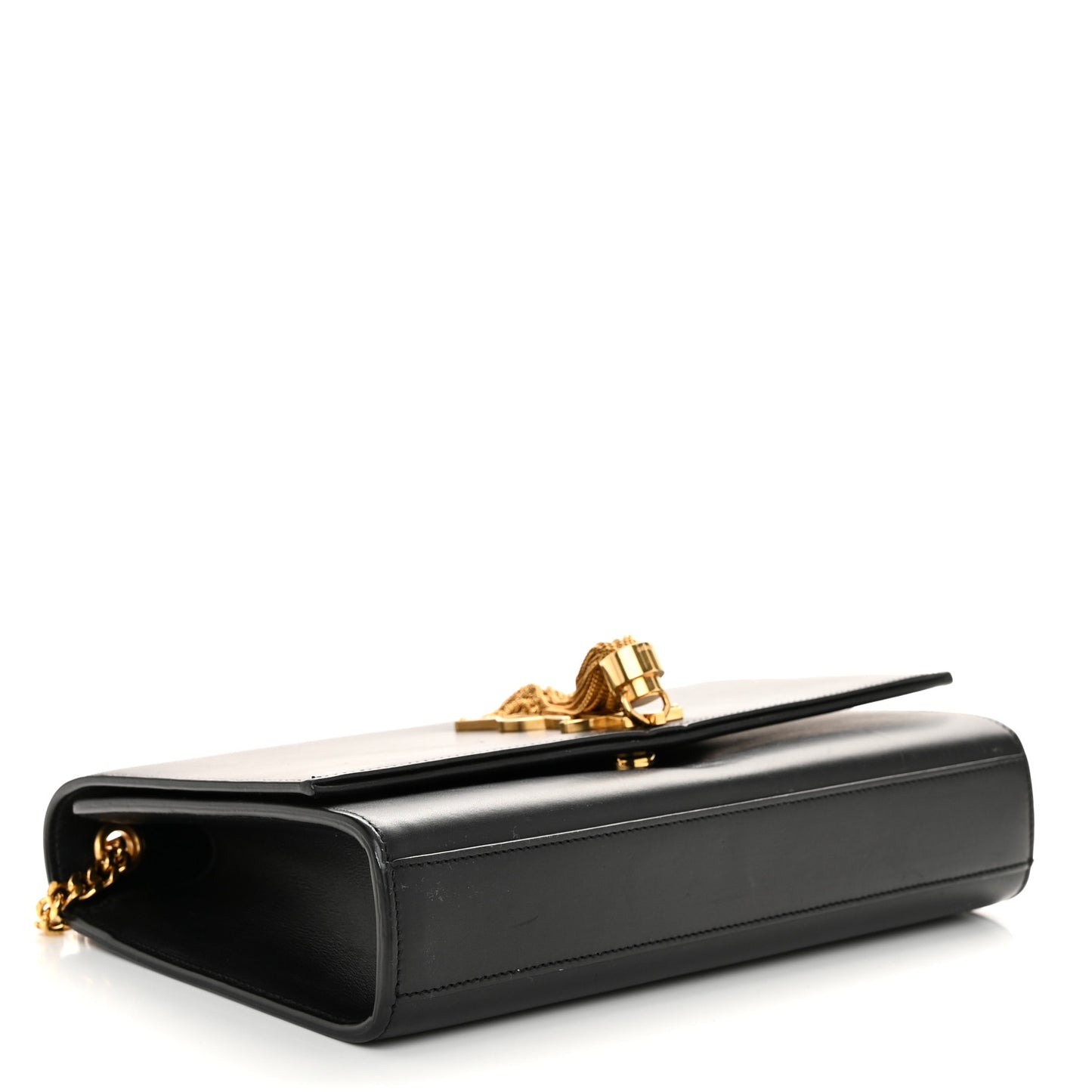 This is an authentic SAINT LAURENT Smooth Calfskin Medium Classic Monogram Kate Tassel Satchel in Black. This clutch is crafted of smooth calfskin leather in black. The bag features a gold chain shoulder strap and a gold YSL logo with tassel pendant on the front. The flap opens with a magnetic snap to a black microsuede interior with a patch pocket.Follow this item for alerts. Saint Laurent is a registered trademark of Saint Laurent. FASHIONPHILE is not affiliated with Saint Laurent.