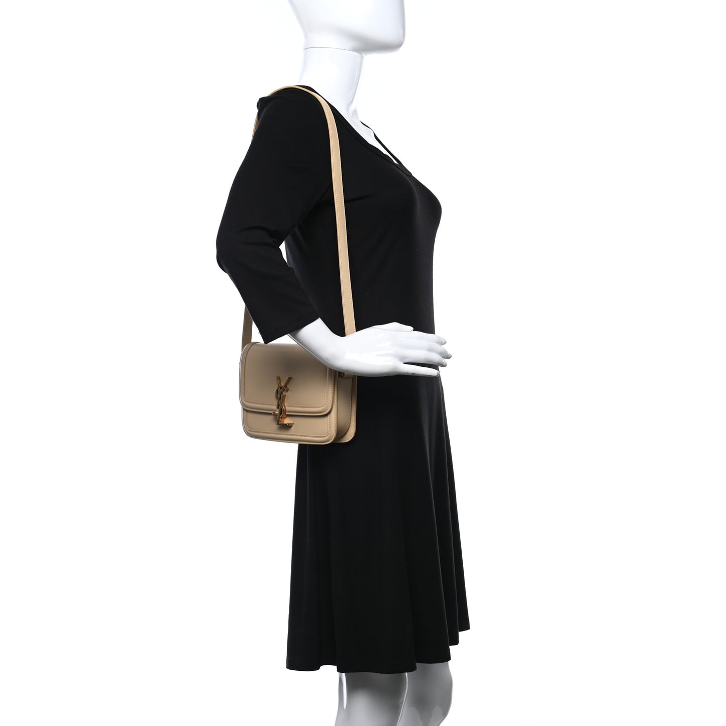 This is an authentic SAINT LAURENT Smooth Calfskin Small Solferino Satchel in Ivory Natural. This chic shoulder bag is crafted of smooth leather in beige. The bag features an adjustable shoulder strap with aged gold hardware. The crossover flap opens with a matching gold YSL monogram press lock to a black leather interior with patch pockets.Follow this item for alerts. Saint Laurent is a registered trademark of Saint Laurent. FASHIONPHILE is not affiliated with Saint Laurent.