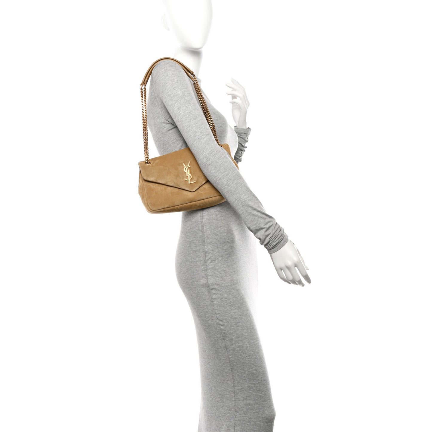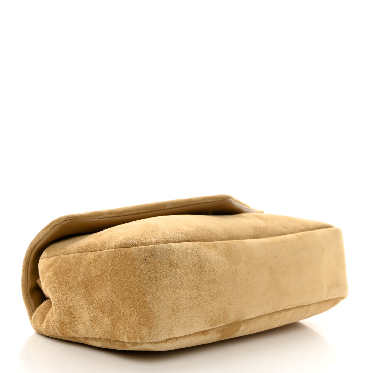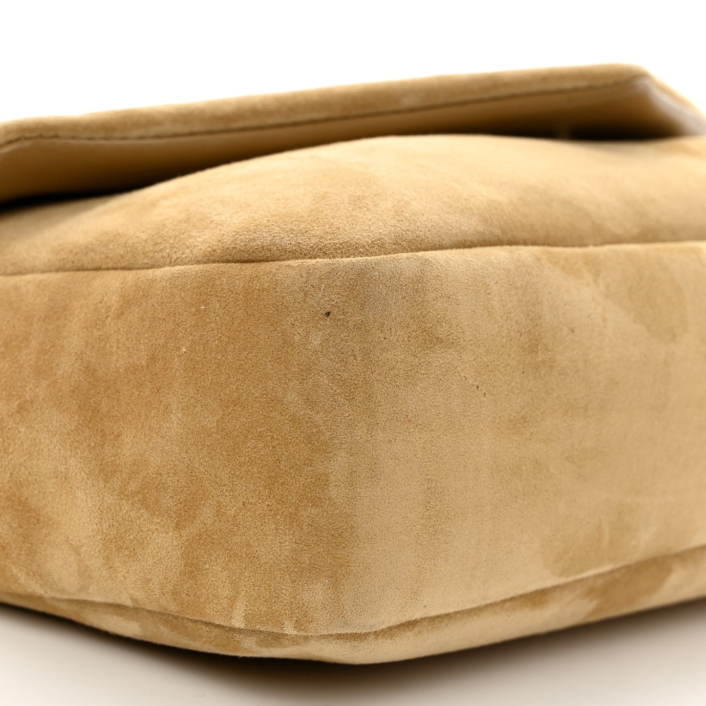 This is an authentic SAINT LAURENT Suede Calypso Crossbody in Fallow. This elegant shoulder bag is crafted of beige suede leather with an aged gold chain link shoulder straps and matching leather shoulder pads. The front features a prominent YSL logo on the flap and opens with a magnetic snap to a black fabric interior with a zipper pocket.Follow this item for alerts. Saint Laurent is a registered trademark of Saint Laurent. FASHIONPHILE is not affiliated with Saint Laurent.