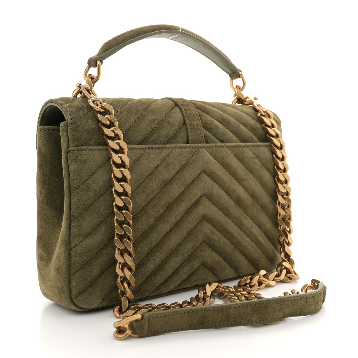 This is an authentic SAINT LAURENT Suede Matelasse Chevron Monogram Medium College Bag in Loden Green. This elegant shoulder bag features chic chevron-quilted suede leather in olive green. The handbag features a suede top handle and an aged gold chain-link shoulder strap with a suede shoulder pad. The front flap features a prominent aged gold YSL monogram detail and opens to a partitioned black fabric interior with zipper and patch pockets.Follow this item for alerts. Saint Laurent is a registered trademark of Saint Laurent. FASHIONPHILE is not affiliated with Saint Laurent.