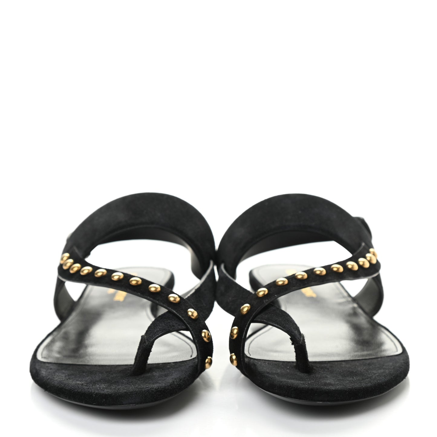 These are authentic SAINT LAURENT Suede Studded Gia Sandals size 38 in Black. These stunning sandals are crafted of black suede calfskin leather and are beautifully detailed with gold studs. These stylish sandals have a thong t-strap that extends upwards towards the ankle with two cutouts that lay across the foot.Follow this item for alerts. Saint Laurent is a registered trademark of Saint Laurent. FASHIONPHILE is not affiliated with Saint Laurent.