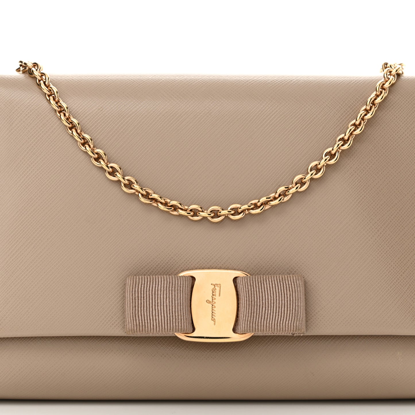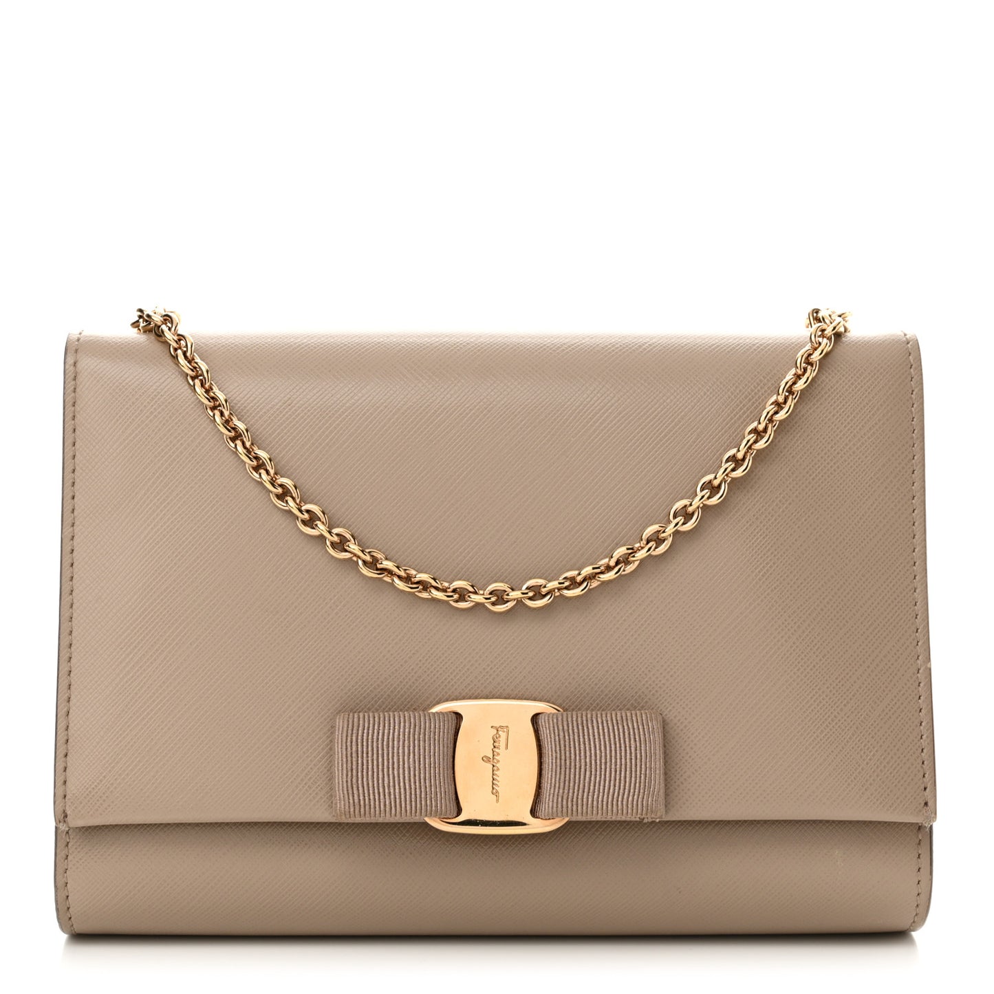 This is an authentic SALVATORE FERRAGAMO Printed Calfskin Ginny Shoulder Bag in Beige. This chic shoulder bag is finely crafted of beige leather. The bag features a long chain link shoulder strap with a frontal bow flap and a Ferregamo ring clasp closure. This opens to a satin interior with pocket.