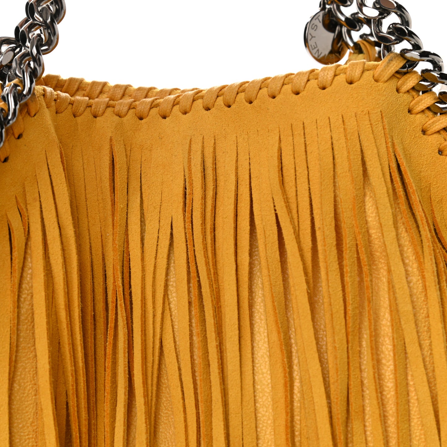 This is an authentic STELLA MCCARTNEY Shaggy Deer Fringe Mini Falabella Tote in Lemon. This stylish tote is crafted of fine animal friendly faux leather in yellow with fringe detail. The bag is bordered with silver chain that makes a continuous link including a shoulder strap and top handles. The top opens with a magnet to a pink jacquard fabric interior with a patch pocket.Follow this item for alerts. Stella McCartney is a registered trademark of Stella McCartney. FASHIONPHILE is not affiliated with Stella McCartney.