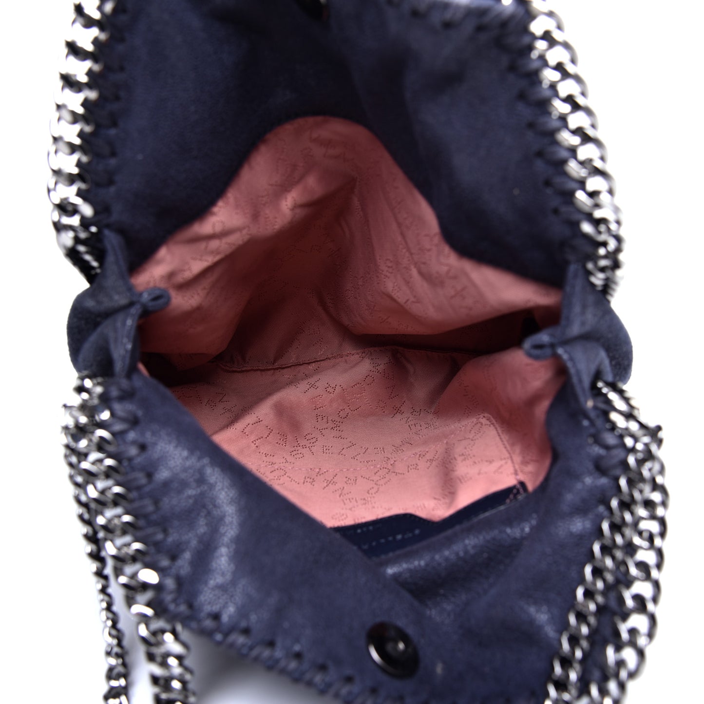 This is an authentic STELLA MCCARTNEY Shaggy Deer Mini Falabella Fold Over Tote in Navy. This chic crossbody bag is crafted of fine shimmery faux leather in dark navy blue. The bag is bordered with ruthenium chains that extend into matching handles and a crossbody strap. The bag opens with a magnet to a rose pink fabric interior with a patch pocket.Follow this item for alerts. Stella McCartney is a registered trademark of Stella McCartney. FASHIONPHILE is not affiliated with Stella McCartney.