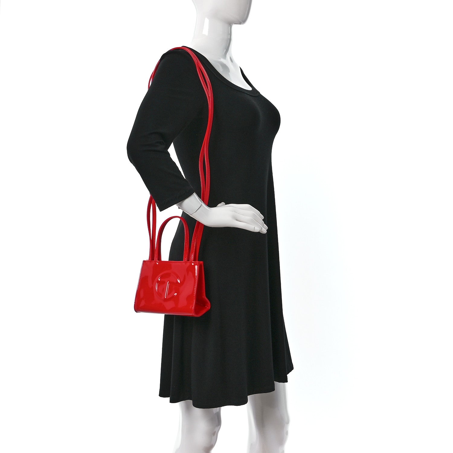 This is an authentic TELFAR Patent Vegan Leather Small Shopping Bag in Red. This mini tote is constructed of patent leather in red with the iconic raised Telfar logo at the front. The shoulder bag has thin red handles and a long crossbody strap. The bag opens to a red fabric interior.Follow this item for alerts. Telfar is a registered trademark of Telfar. FASHIONPHILE is not affiliated with Telfar.