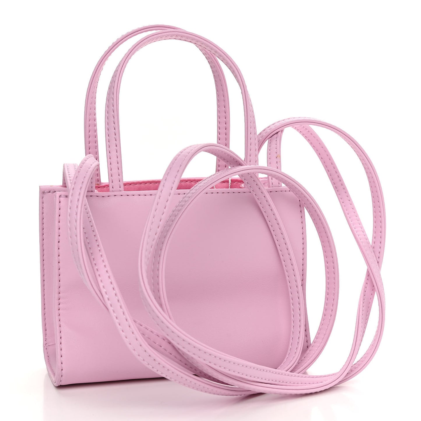 This is an authentic TELFAR Vegan Leather Small Shopping Bag in Bubblegum. This mini tote is constructed of faux leather in pink with the iconic raised Telfar logo at the front. The shoulder bag has thin pink handles and a long crossbody strap. The bag opens to a pink fabric interior.Follow this item for alerts. Telfar is a registered trademark of Telfar. FASHIONPHILE is not affiliated with Telfar.
