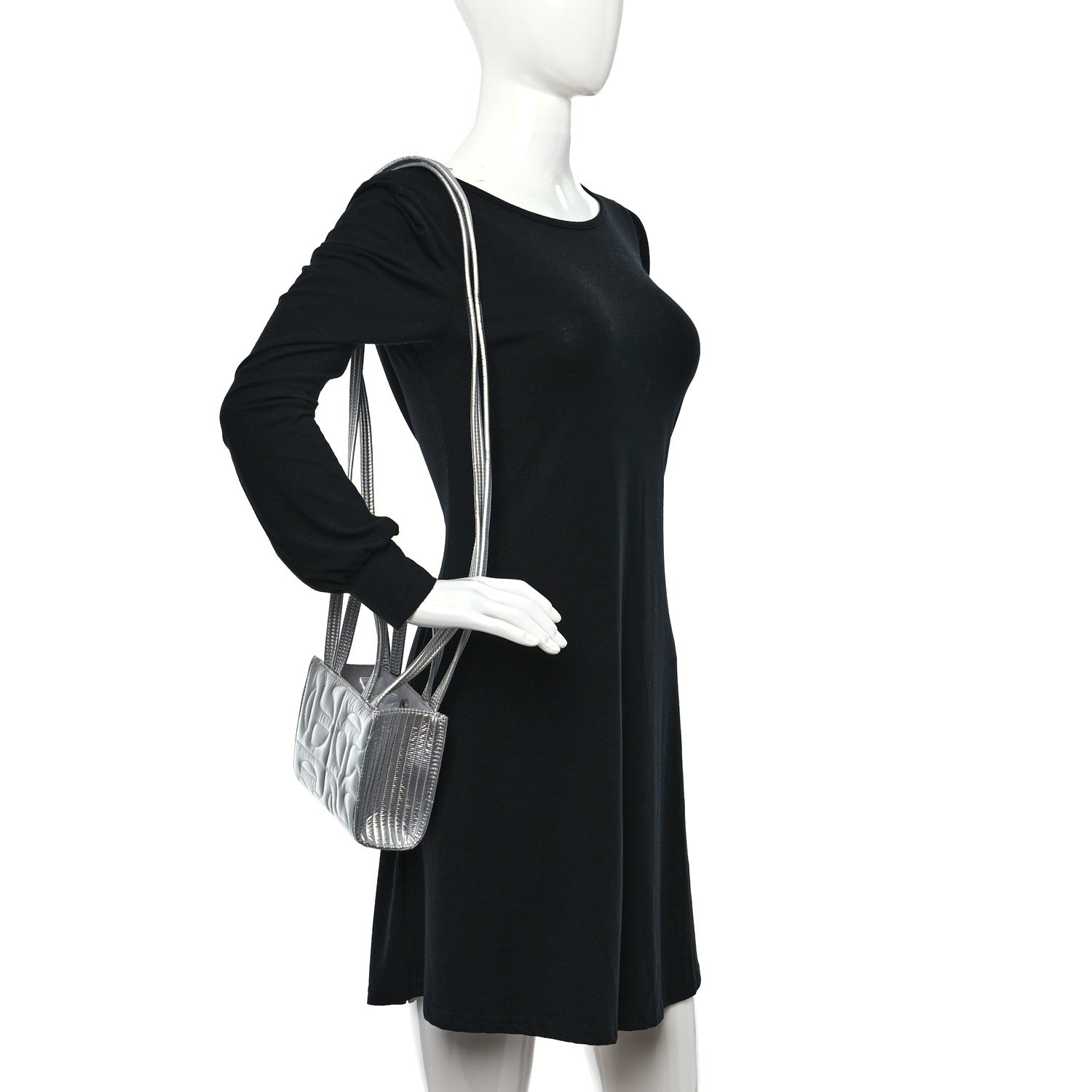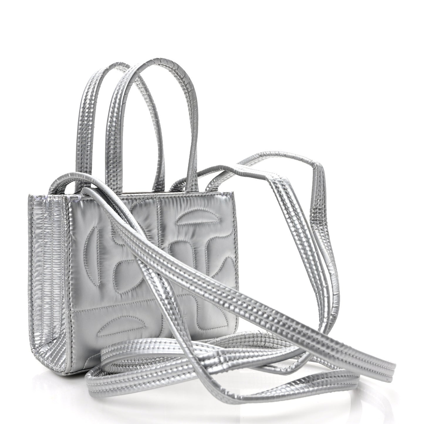 This is an authentic TELFAR x MOOSE KNUCKLES Nylon Quilted Small Shopping Bag in Silver. This mini tote is constructed of silver nylon, with the iconic raised Telfar logo at the front. The shoulder bag has mesh pockets on the sides, short handles, and a shoulder strap. The top opens to a compact silver canvas interior.Follow this item for alerts. Telfar is a registered trademark of Telfar. FASHIONPHILE is not affiliated with Telfar.