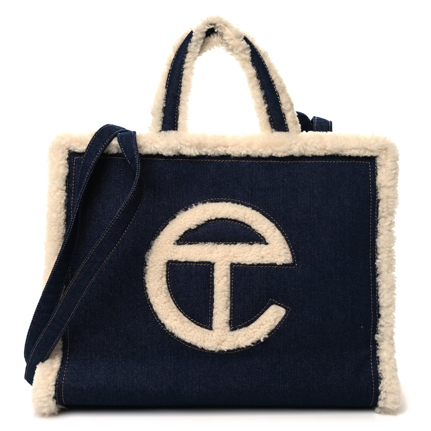 This is an authentic TELFAR X UGG Denim Shearling Medium Shopping Bag in Raw Denim. This tote is constructed of blue denim with beige shearling trim. The shoulder bag features denim handles with shearling trim, and a long denim crossbody strap. The bag opens to a denim fabric interior with a zipper pocket.Follow this item for alerts. Telfar is a registered trademark of Telfar. FASHIONPHILE is not affiliated with Telfar.