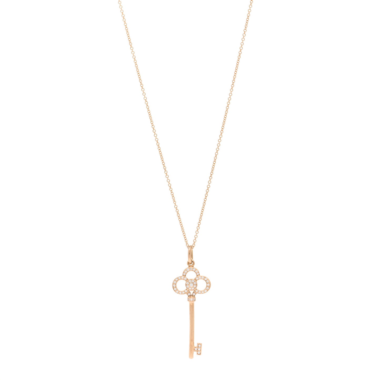 This is an authentic TIFFANY 18K Rose Gold Diamond Crown Key Pendant Necklace. The necklace is crafted of 18 karat rose gold and features a crown key motif pendant accented with round brilliant cut diamonds, approximately .11 total carat weight.Follow this item for alerts. Tiffany is a registered trademark of Tiffany. FASHIONPHILE is not affiliated with Tiffany.