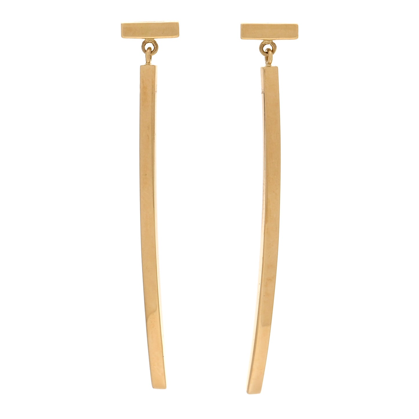 This is an authentic pair of TIFFANY 18K Yellow Gold T Bar Earrings. The earrings are crafted of 18 karat yellow gold and feature elongated vertical curved bars suspended from 'T' motif studs.Follow this item for alerts. Tiffany is a registered trademark of Tiffany. FASHIONPHILE is not affiliated with Tiffany.