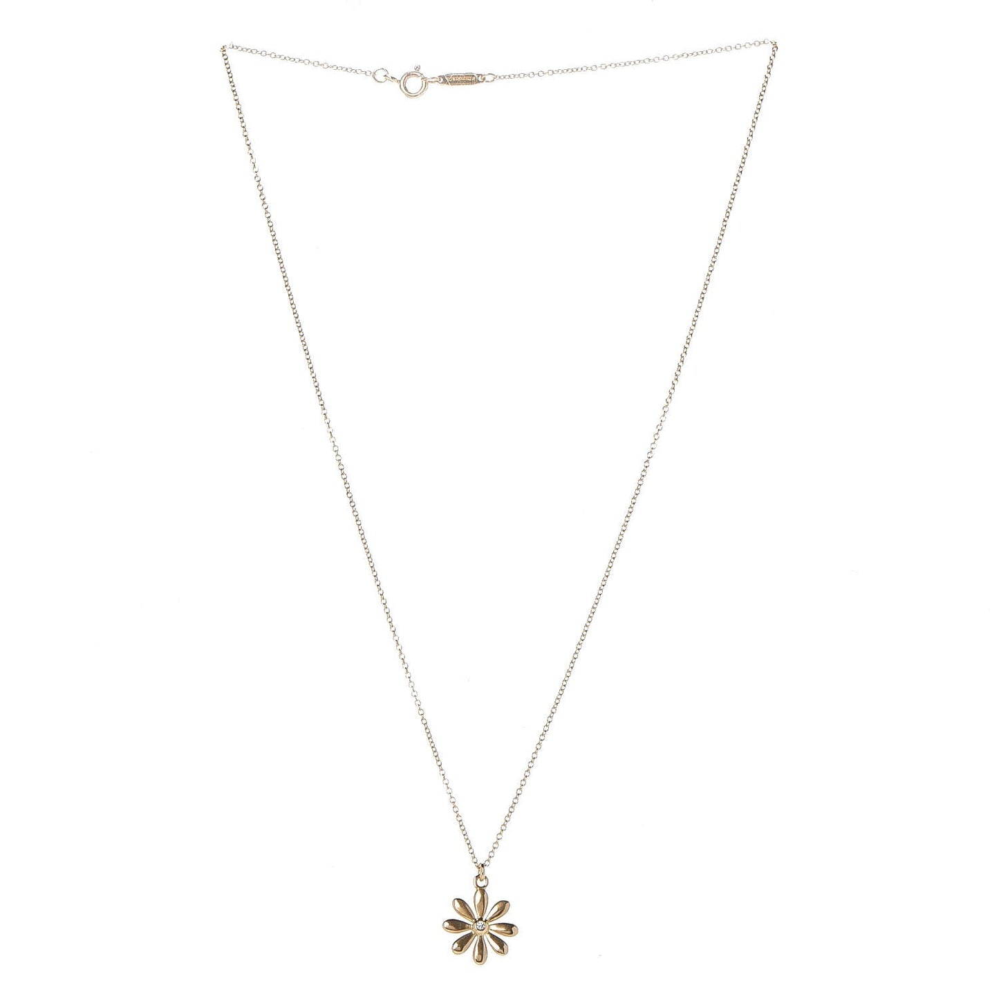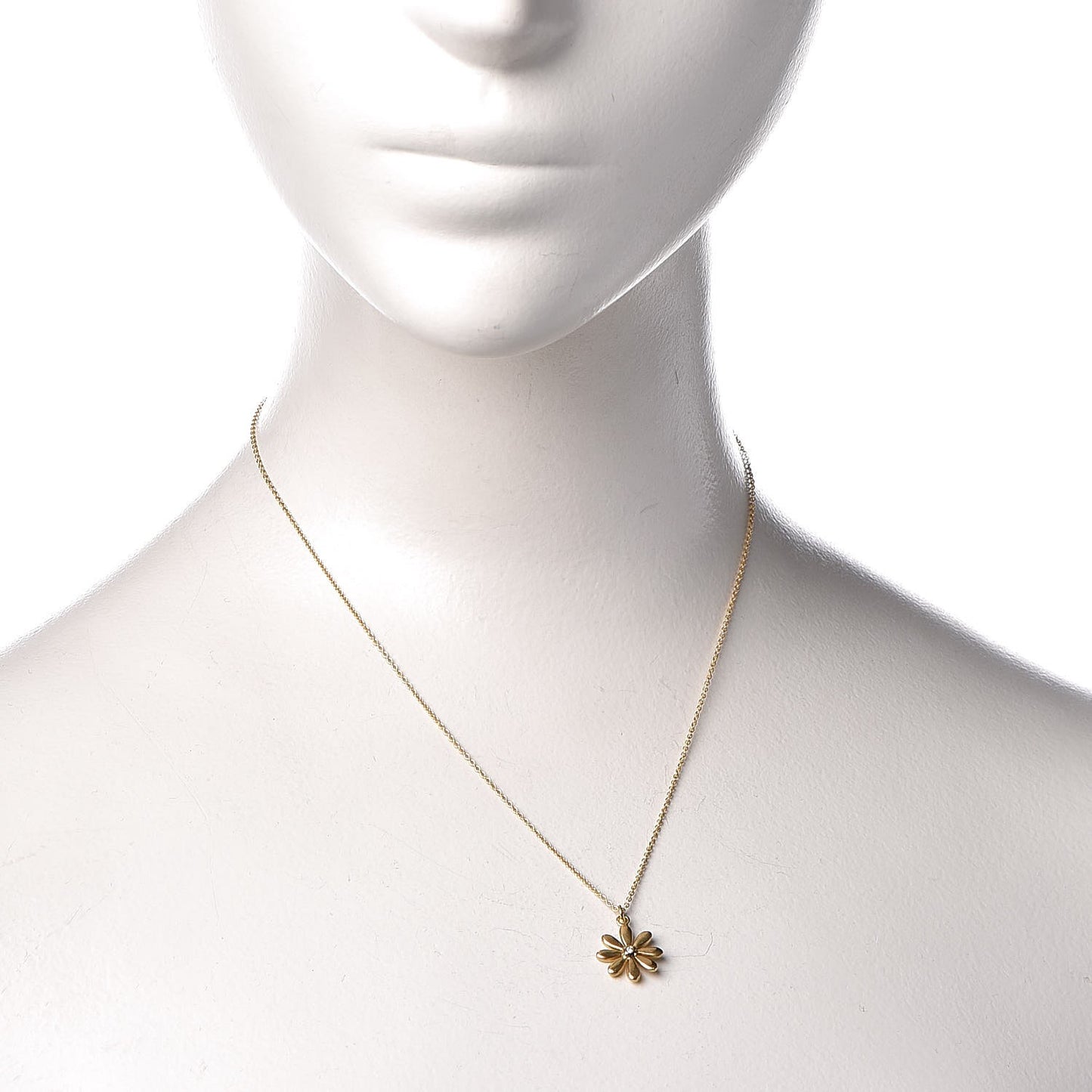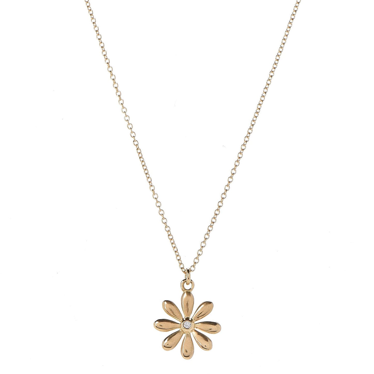 This is an authentic TIFFANY & CO 18K Gold Diamond Flower Pendant Necklace. This lovely necklace has an 18 karat gold chain with a lovely daisy flower pendant and a round brilliant cut diamond in the center. This is a stylish necklace for a distinctive look from Tiffany & Co.Follow this item for alerts. Tiffany is a registered trademark of Tiffany. FASHIONPHILE is not affiliated with Tiffany.