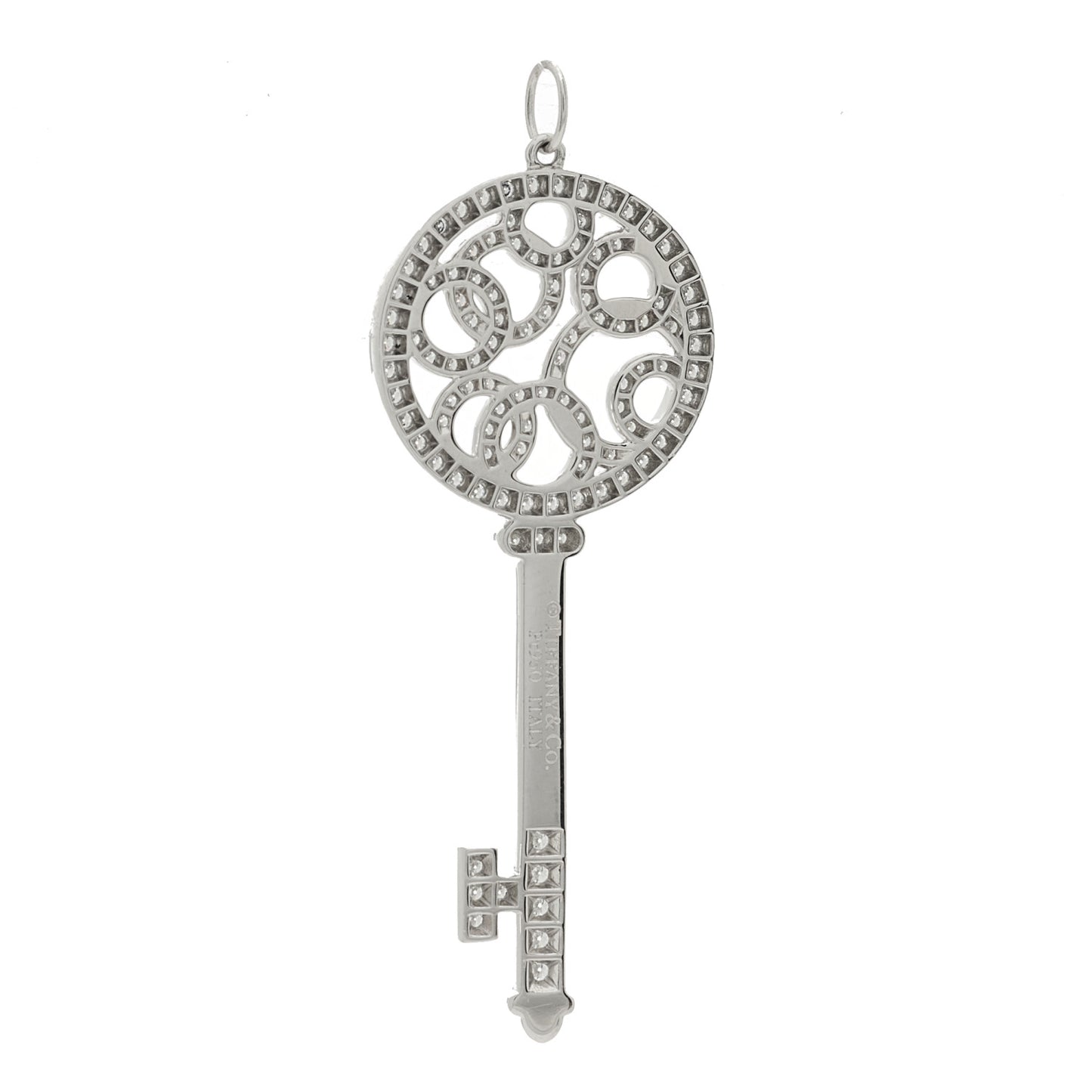 This is an authentic TIFFANY Platinum Diamond Bubbles Key Pendant. The pendant is crafted of platinum and features a key motif with circular "bubbles" set with round cut diamonds weighing approximately .93 total carat weight.