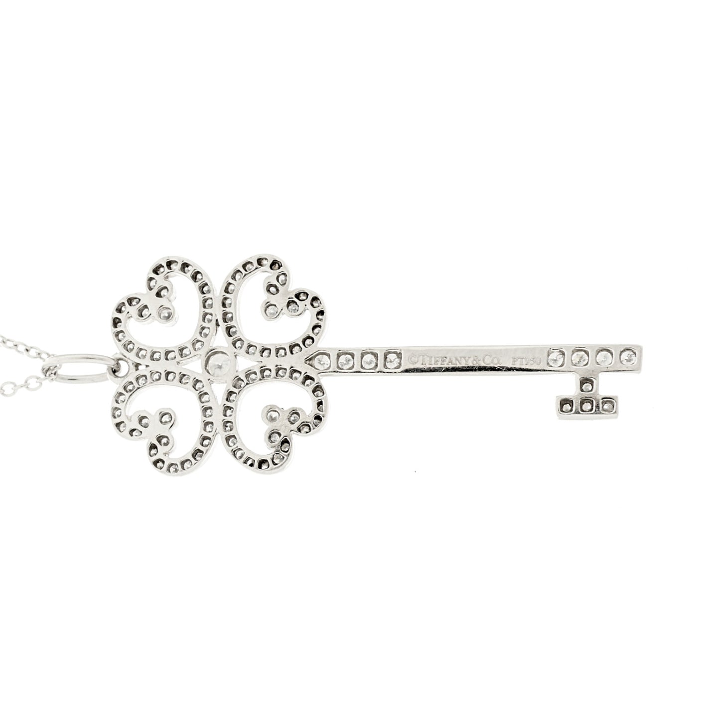 This is an authentic TIFFANY Platinum Diamond Enchant Quatra Heart Key Pendant. Necklace . The necklace features a modified heart key motif set with round brilliant cut diamonds weighing .32 total carat weight.Follow this item for alerts. Tiffany is a registered trademark of Tiffany. FASHIONPHILE is not affiliated with Tiffany.