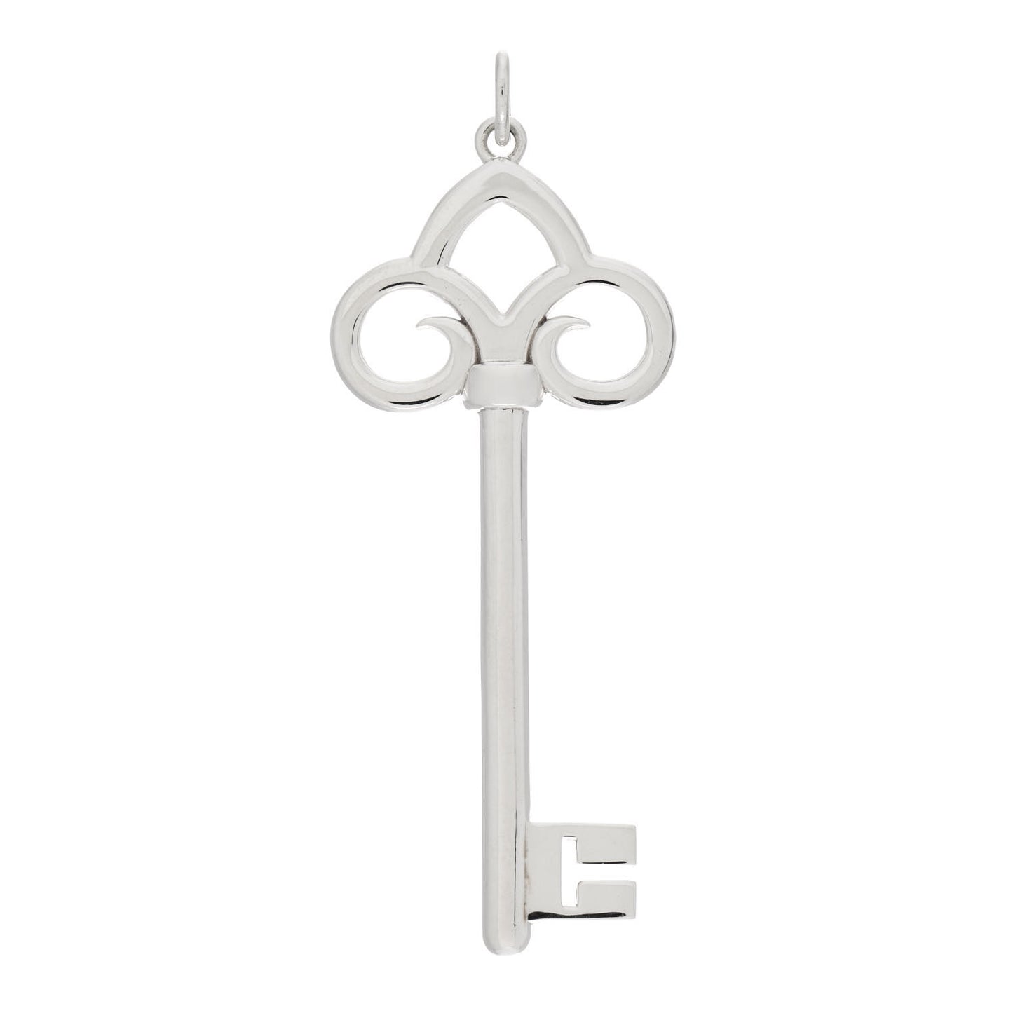 This is an authentic TIFFANY Sterling Silver Fleur De Lis Key Pendant. The pendant is crafted of sterling silver and features a large skeleton key motif with a high polish finish.