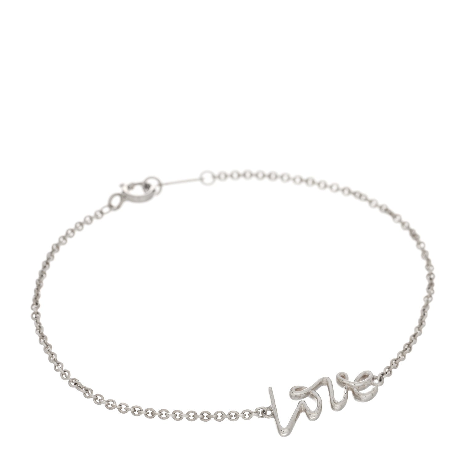 This is an authentic TIFFANY Sterling Silver Graffiti Love Bracelet. The bracelet is crafted of sterling silver and features the word 'Love' in script stationed on a polished delicate chain.Follow this item for alerts. Tiffany is a registered trademark of Tiffany. FASHIONPHILE is not affiliated with Tiffany.