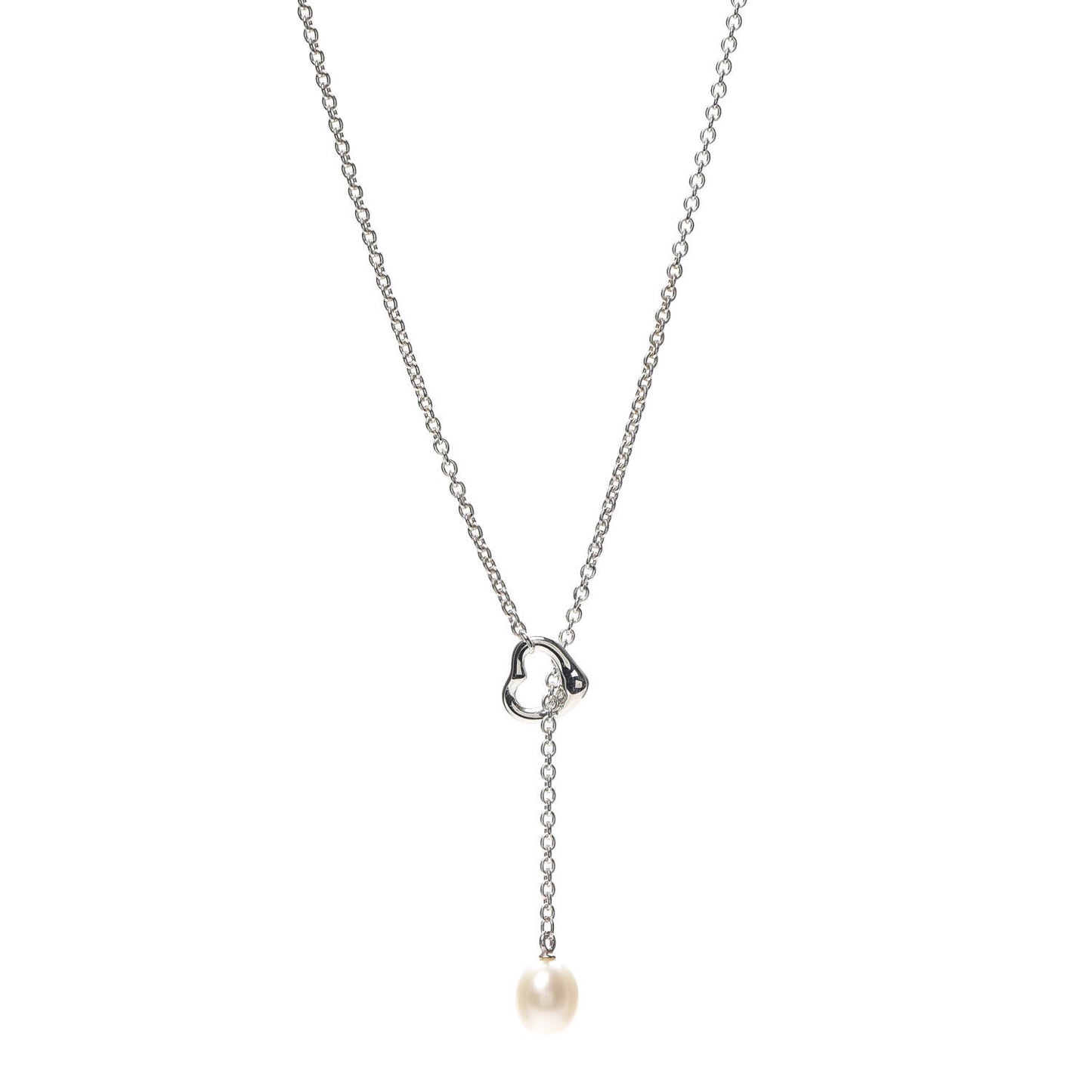 This is an authentic TIFFANY Sterling Silver Pearl 9-9.5mm Elsa Peretti Open Heart Lariat Necklace. The necklace is crafted of sterling silver and features an open heart motif with a cultured freshwater white pearl drop pendant.Follow this item for alerts. Tiffany is a registered trademark of Tiffany. FASHIONPHILE is not affiliated with Tiffany.