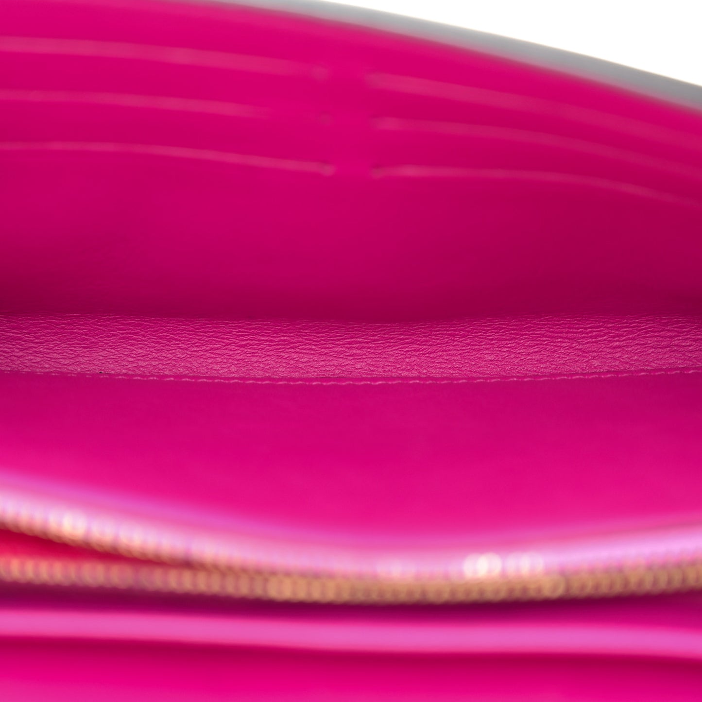 This is an authentic VALENTINO GARAVANI Vitello Rockstud Wallet On Chain in Fuxia. This chic clutch sized wallet is beautifully crafted of rich smooth calfskin leather in fuschia. The wallet features the signature Valentino studded design along the borders of the wallet with polished gold pyramid studs. This is a versatile wallet that may be used in multiple ways with the optional light gold chain linked shoulder strap. The front facing flap opens to a compartmentalized matching leather interior with two card slot panels, two patch pockets, and a central zippered compartment.Follow this item for alerts. Valentino Garavani is a registered trademark of Valentino Garavani. FASHIONPHILE is not affiliated with Valentino Garavani.