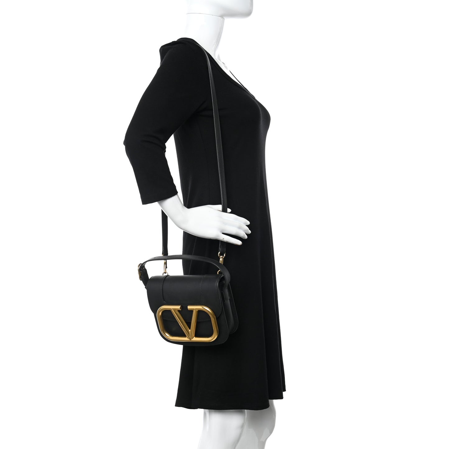 This is an authentic VALENTINO GARAVANI Calfskin Small Supervee Crossbody Bag in Black. This small shoulder bag is beautifully crafted of smooth calfskin leather in black. It features a magnetic closure with a gold logo and a leather shoulder strap that can be extended. The magnetic flap opens to a leather interior with a patch pocket.Follow this item for alerts. Valentino Garavani is a registered trademark of Valentino Garavani. FASHIONPHILE is not affiliated with Valentino Garavani.
