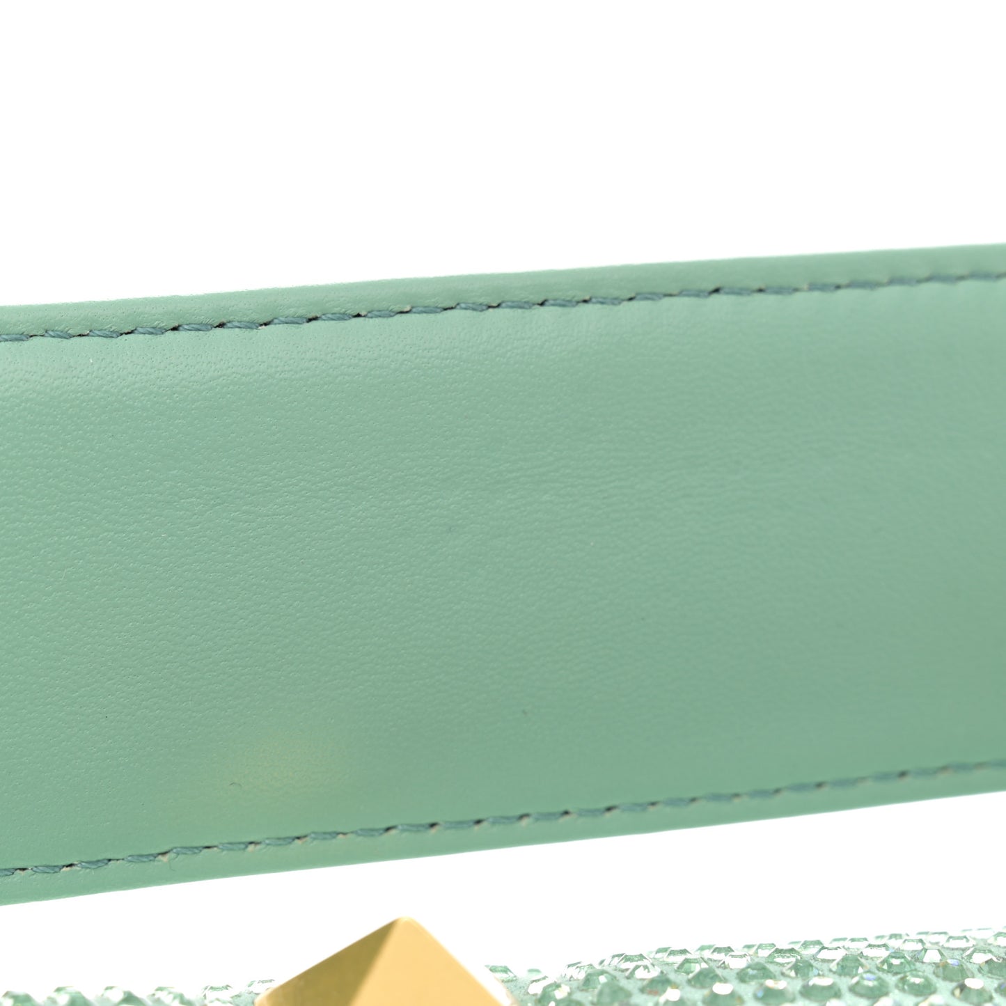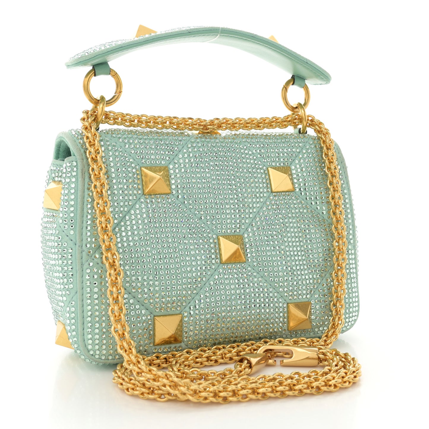 This is an authentic VALENTINO GARAVANI Crystal Suede Small Roman Stud Shoulder Bag in Green. This chic shoulder bag is beautifully crafted of rhinestones with antique brass pyramid studs throughout. The bag features a removable antique brass chain shoulder strap and a looping leather handle. The crossover flap opens to a matching nappa leather interior with zipper and patch pockets.