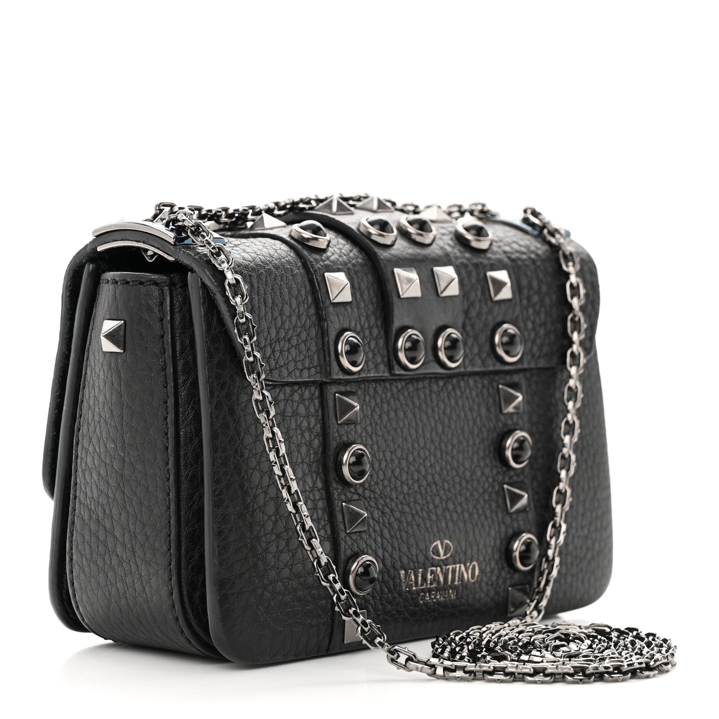 This is an authentic VALENTINO GARAVANI Grained Calfskin Onyx Micro B-Rockstud Rolling Flap in Black. This unique shoulder bag is beautifully crafted of finely textured calfskin leather in black. The bag features a dark silver chain shoulder strap, studded borders, and a studded dark silver lock for the front flap. This opens to a 3 compartment black suede leather interior.Follow this item for alerts. Valentino Garavani is a registered trademark of Valentino Garavani. FASHIONPHILE is not affiliated with Valentino Garavani.