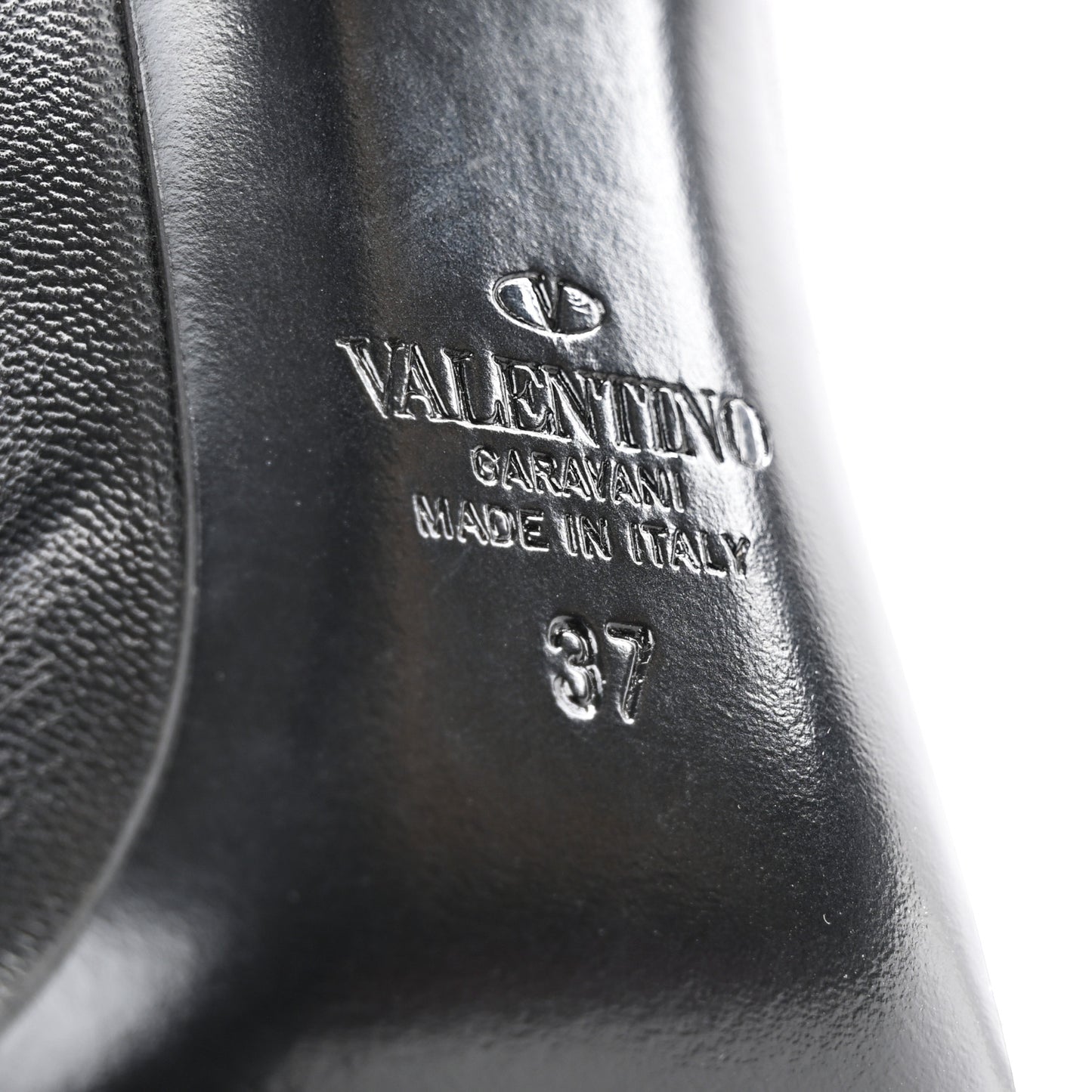 This is an authentic pair of VALENTINO GARAVANI Kidskin Rockstud Alcove 110mm Pumps size 37 in Black. These pumps are crafted of smooth goatskin leather in black. There is an elongated point toe, a 4-inch heel, and smooth leather lined with pyramid studs.Follow this item for alerts. Valentino Garavani is a registered trademark of Valentino Garavani. FASHIONPHILE is not affiliated with Valentino Garavani.
