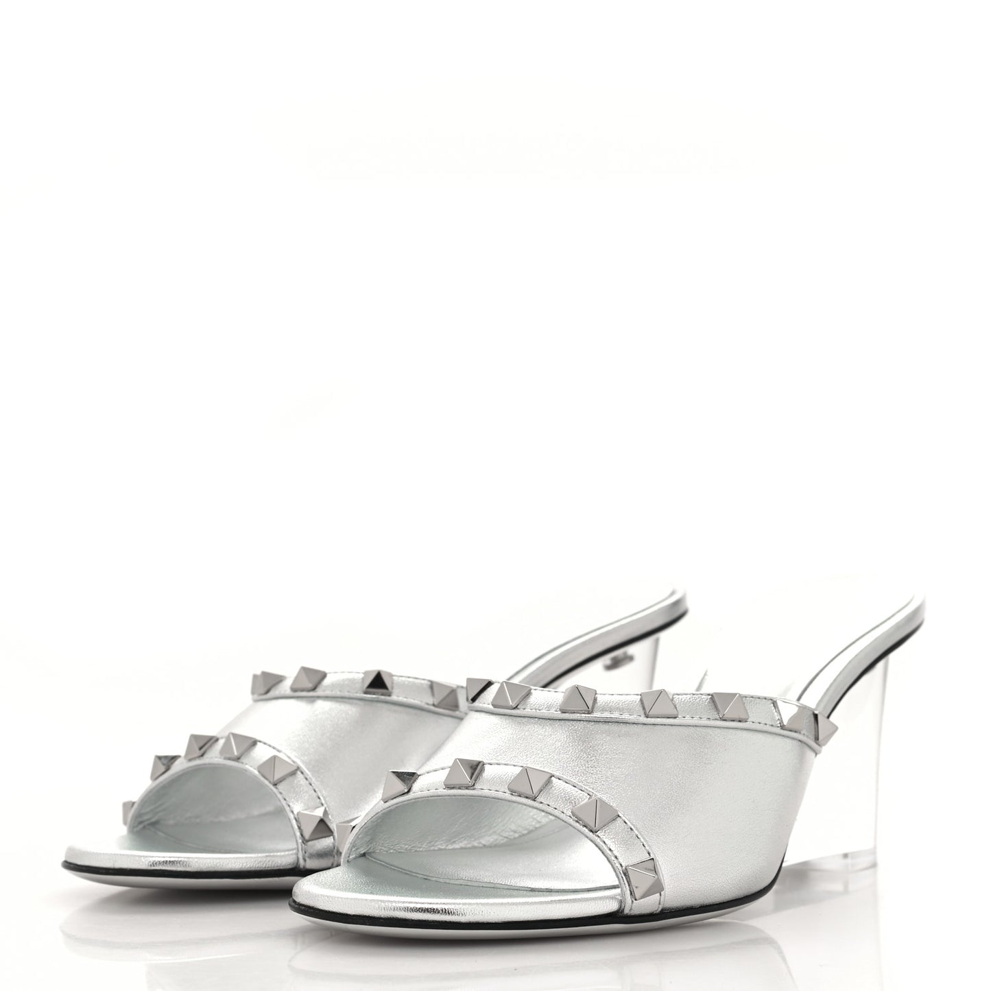 Valentino Garavani/ Accessories/ Shoes /Valentino Garavani Metallic Lambskin Plexiglass Rockstud 75mm Wedge Sandals 37 Silver Transparent