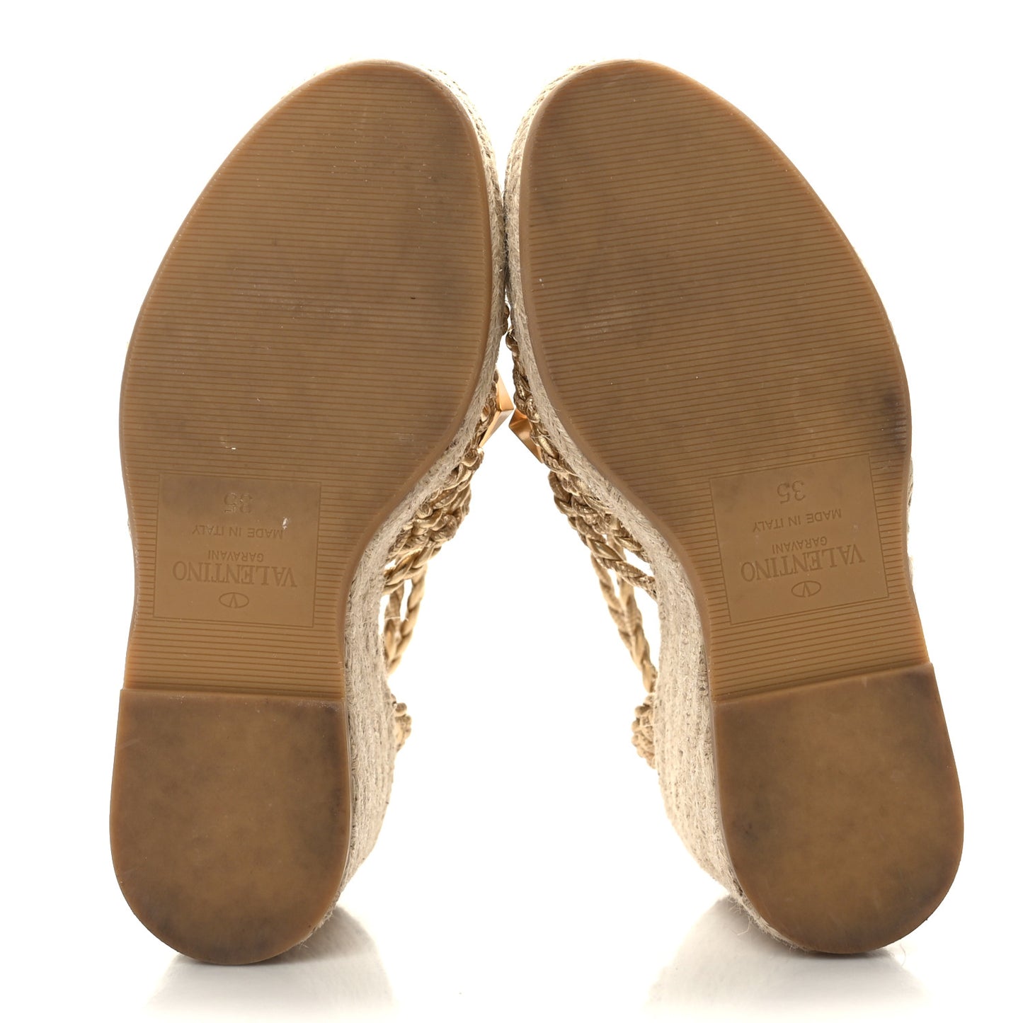 Valentino Garavani/ Accessories/ Shoes /Valentino Garavani Metallic Nappa Woven Roman Stud Macrome Espadrille Wedge Ankle Wrap Sandals 35 Star Gold