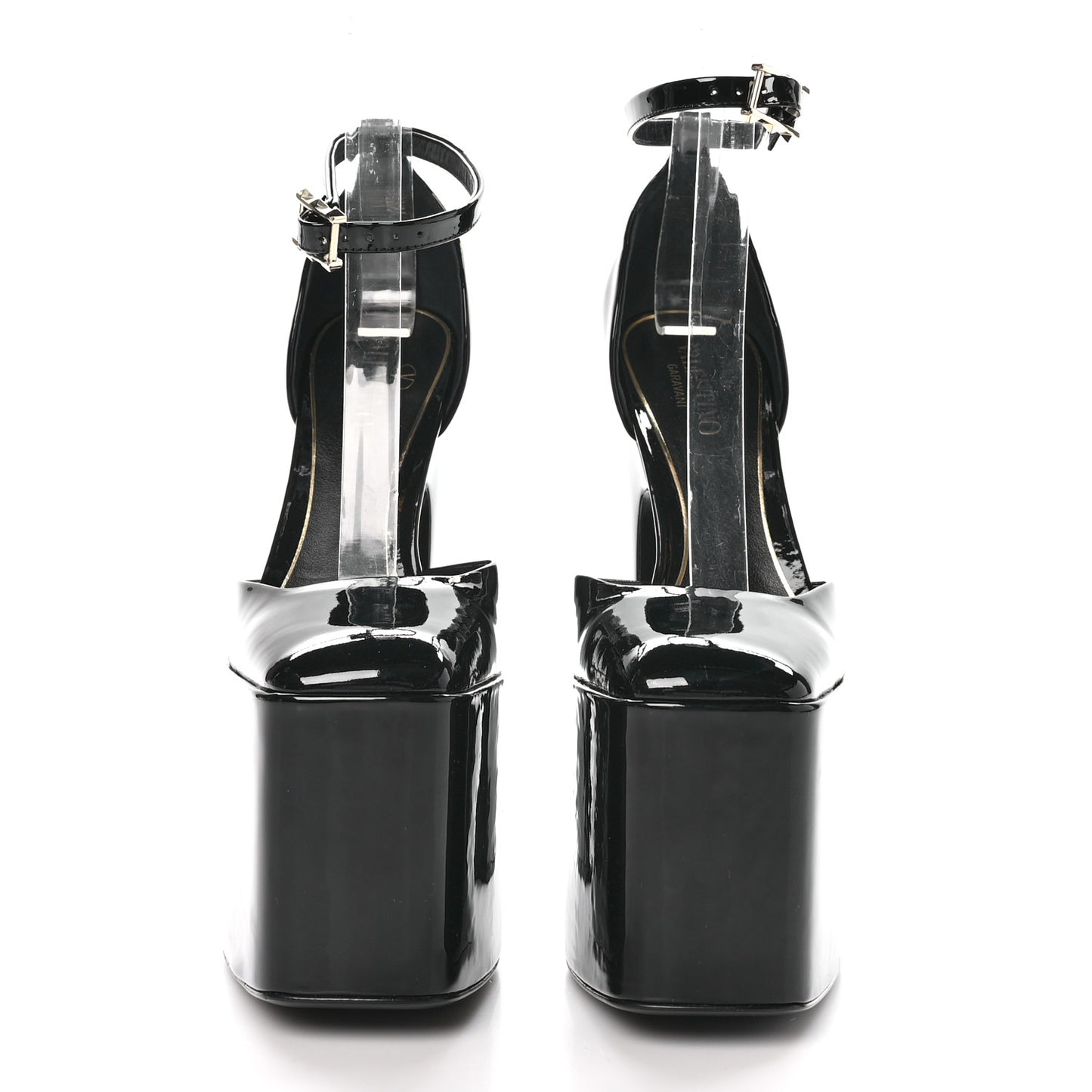 This is an authentic pair of VALENTINO GARAVANI Patent DiscoBox 80/180mm Platform Pumps size 35 in Black. These heels are crafted of black patent leather. They feature gold V plate logo hardware on the adjustable ankle straps and a 3.25-inch platform with a 7.25-inch heel.Follow this item for alerts. Valentino Garavani is a registered trademark of Valentino Garavani. FASHIONPHILE is not affiliated with Valentino Garavani.