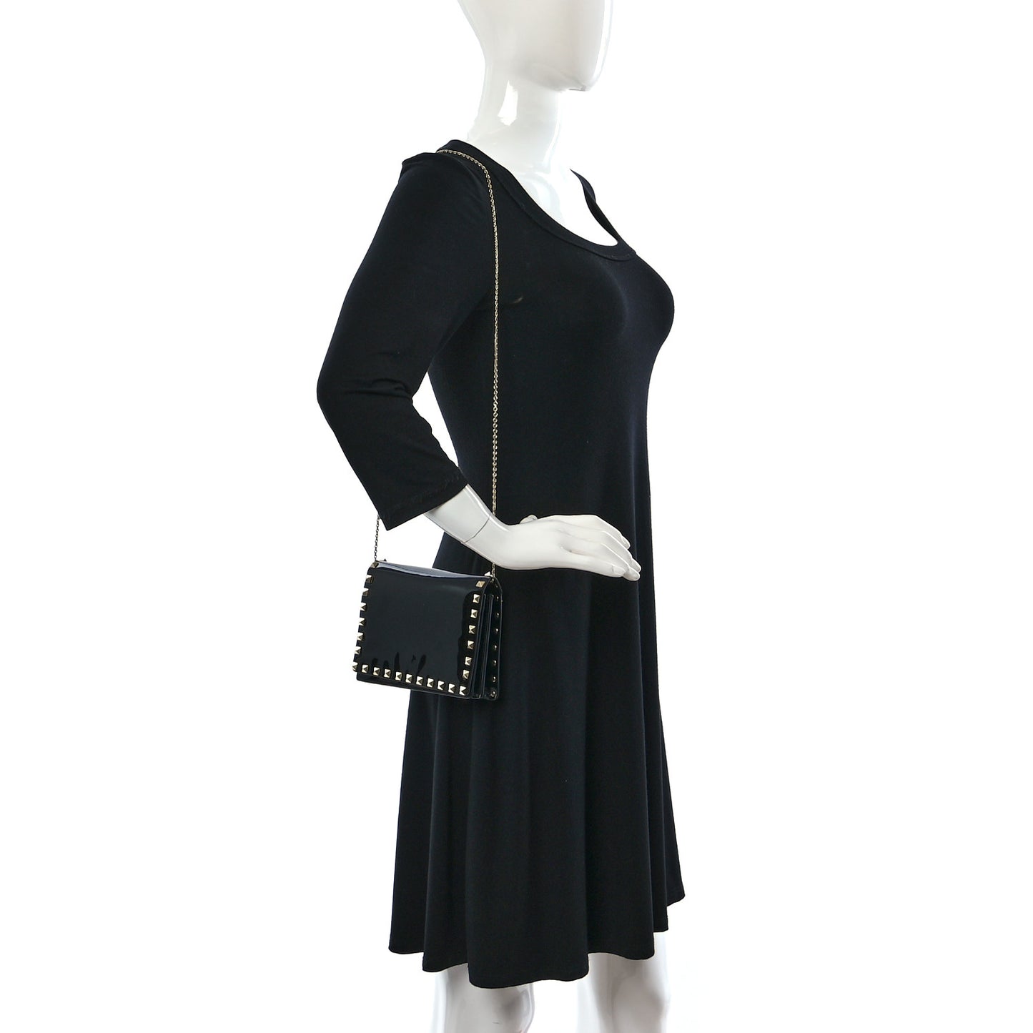 This is an authentic VALENTINO GARAVANI Patent Rockstud Wallet On Chain in Black. This chic cross-body bag is beautifully crafted of finely textured leather in black and light gold hardware. The bag features studded borders a thin chain-link shoulder strap and a full-length front flap. This opens to a flap pocket and a matching interior with a central zipped compartment and card slots.Follow this item for alerts. Valentino Garavani is a registered trademark of Valentino Garavani. FASHIONPHILE is not affiliated with Valentino Garavani.