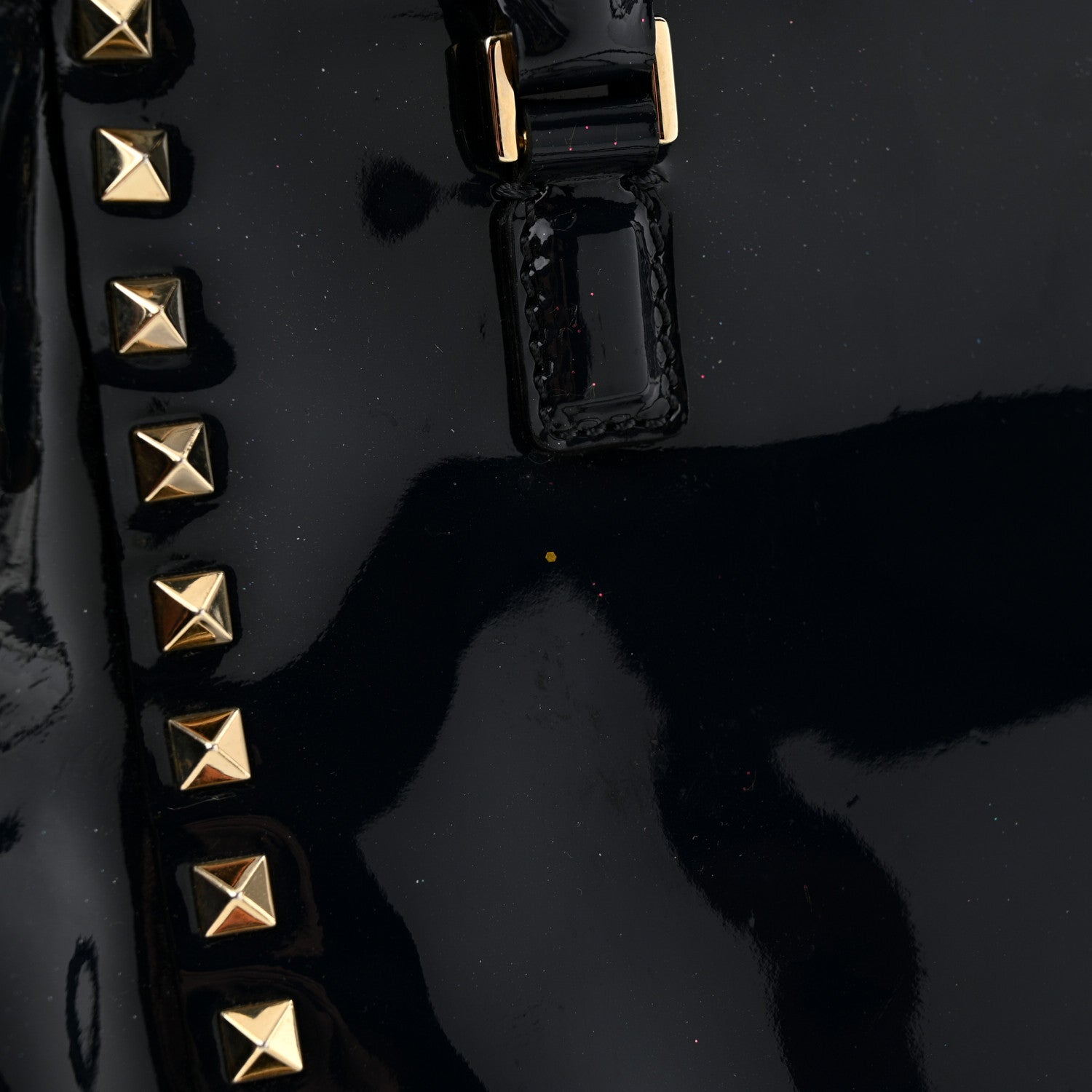 This is an authentic VALENTINO GARAVANI Patent Small Rockstud Double Handle Tote in Marine. This stunning tote is crafted of polished patent leather in dark blue with gold diamond studs that line the borders of the bag. The bag features rolled leather top handles and an optional shoulder strap lined with studs. The flip-lock opens to a beige fabric interior with zipper and patch pockets.Follow this item for alerts. Valentino Garavani is a registered trademark of Valentino Garavani. FASHIONPHILE is not affiliated with Valentino Garavani.