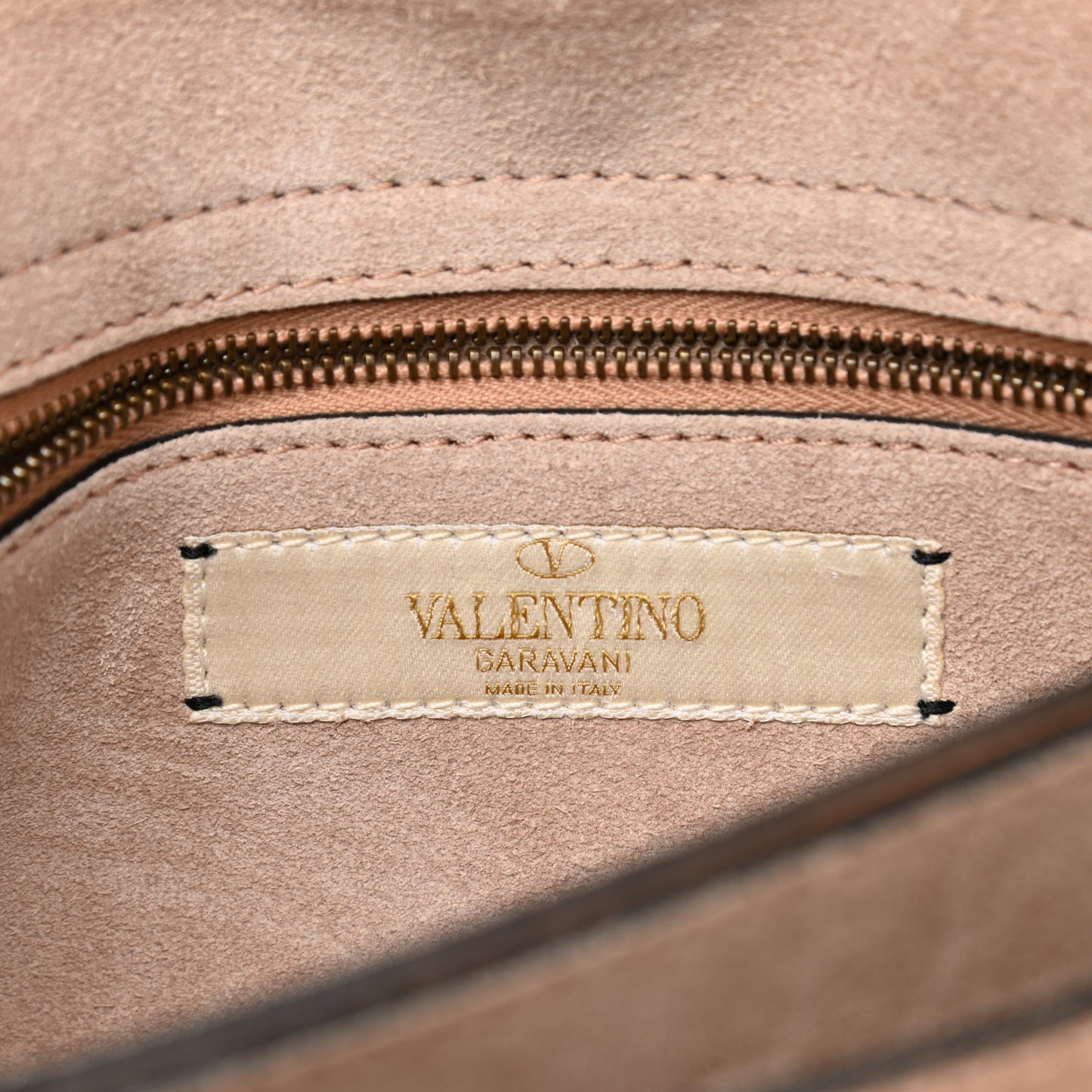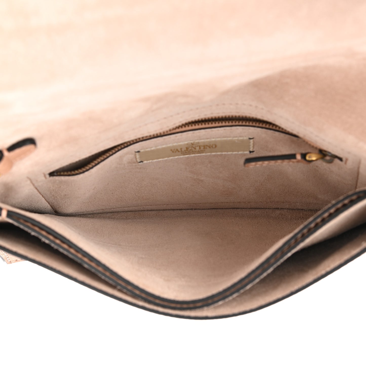 This is an authentic VALENTINO GARAVANI Pebbled Calfskin Beaded Rockstud Wristlet Clutch in Soft Noisette. This chic evening clutch is beautifully crafted of beige leather with gold pyramid studs around every edge, a beaded front handle, and a removable gold studded leather wristlet strap. The full-frontal flap opens to a partitioned beige suede leather interior.Follow this item for alerts. Valentino Garavani is a registered trademark of Valentino Garavani. FASHIONPHILE is not affiliated with Valentino Garavani.