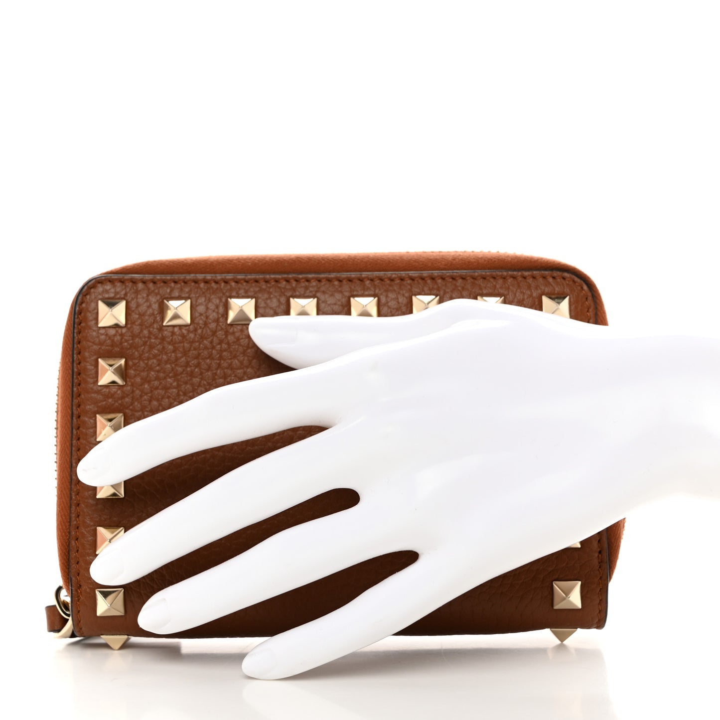 Pebbled Calfskin Rockstud Compact Zip Around Wallet Bright Cognac
