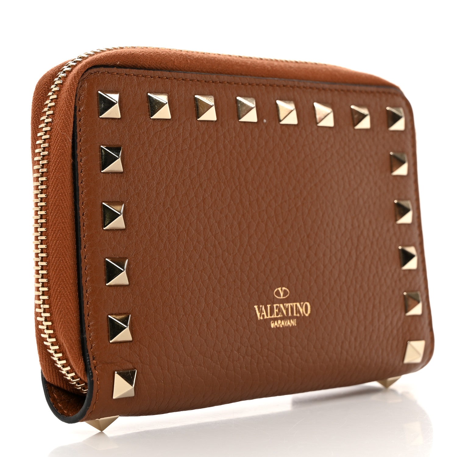 Valentino Garavani/ Accessories/ Wallets /Valentino Garavani Pebbled Calfskin Rockstud Compact Zip Around Wallet Bright Cognac